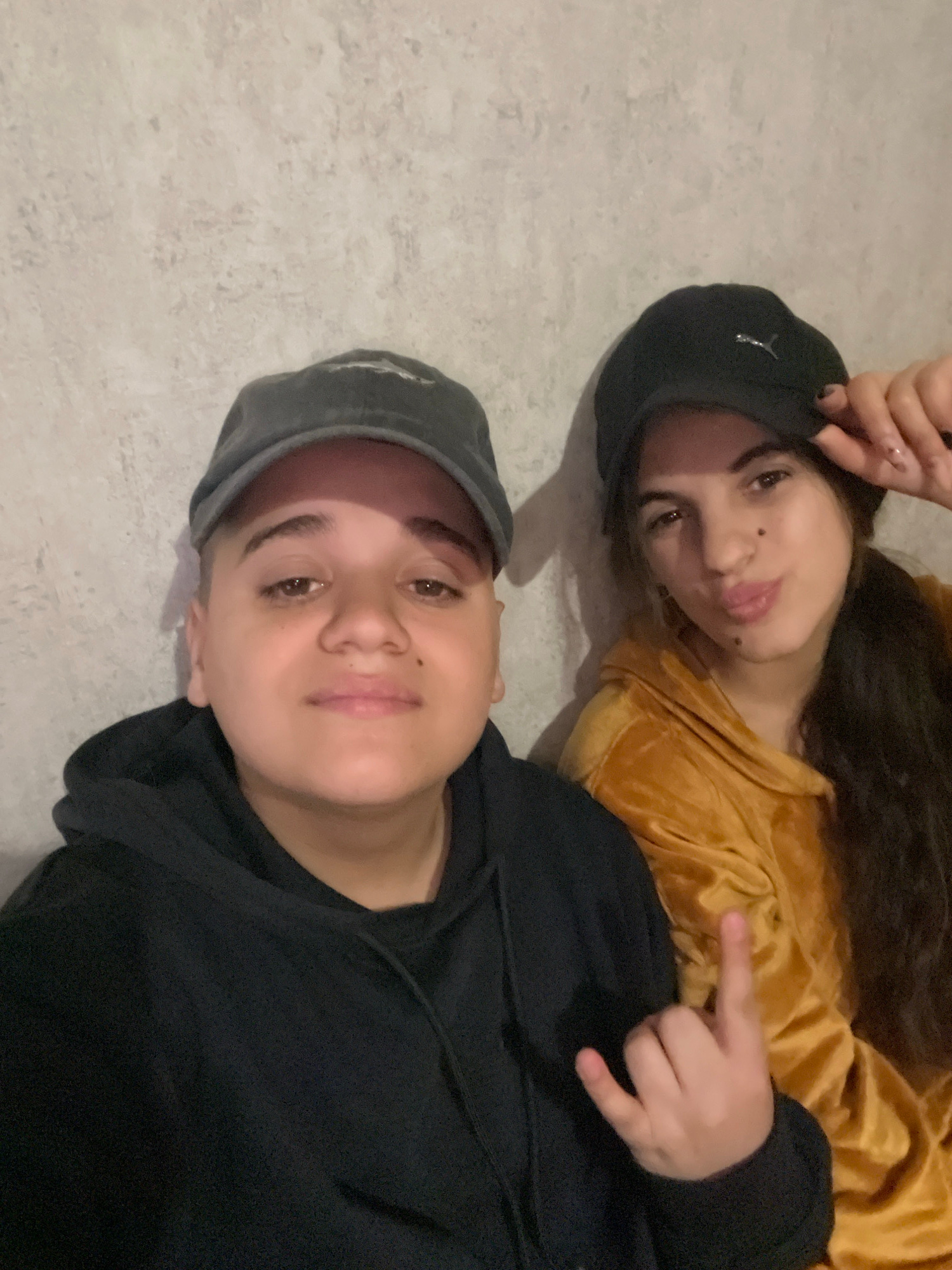 Two individuals are lying on a light-colored surface, likely a floor, indoors. The person in the foreground is wearing a dark grey cap and a black hooded sweatshirt. The second person, positioned behi…read more