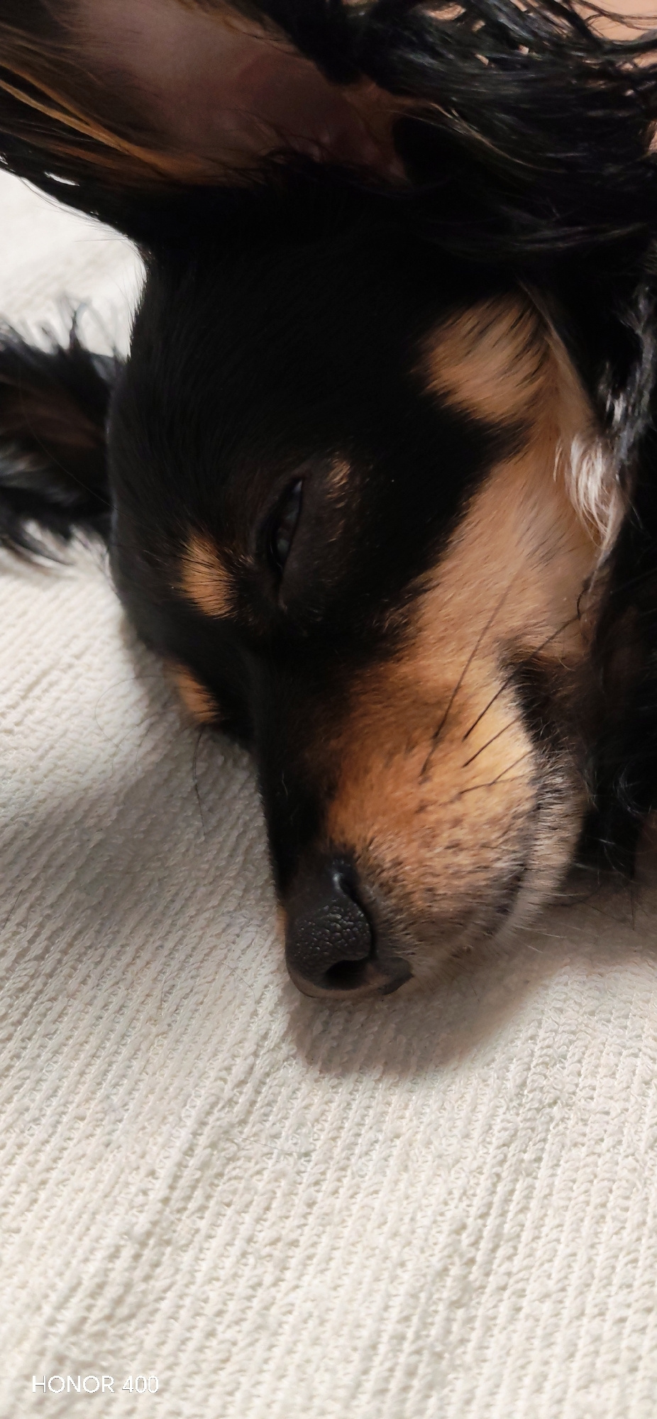 A close-up shot depicts a sleeping dog with black and tan fur lying on a white textured surface, possibly a blanket or cushion. The dog's eyes are partially closed, and its black nose is prominent. Th…read more