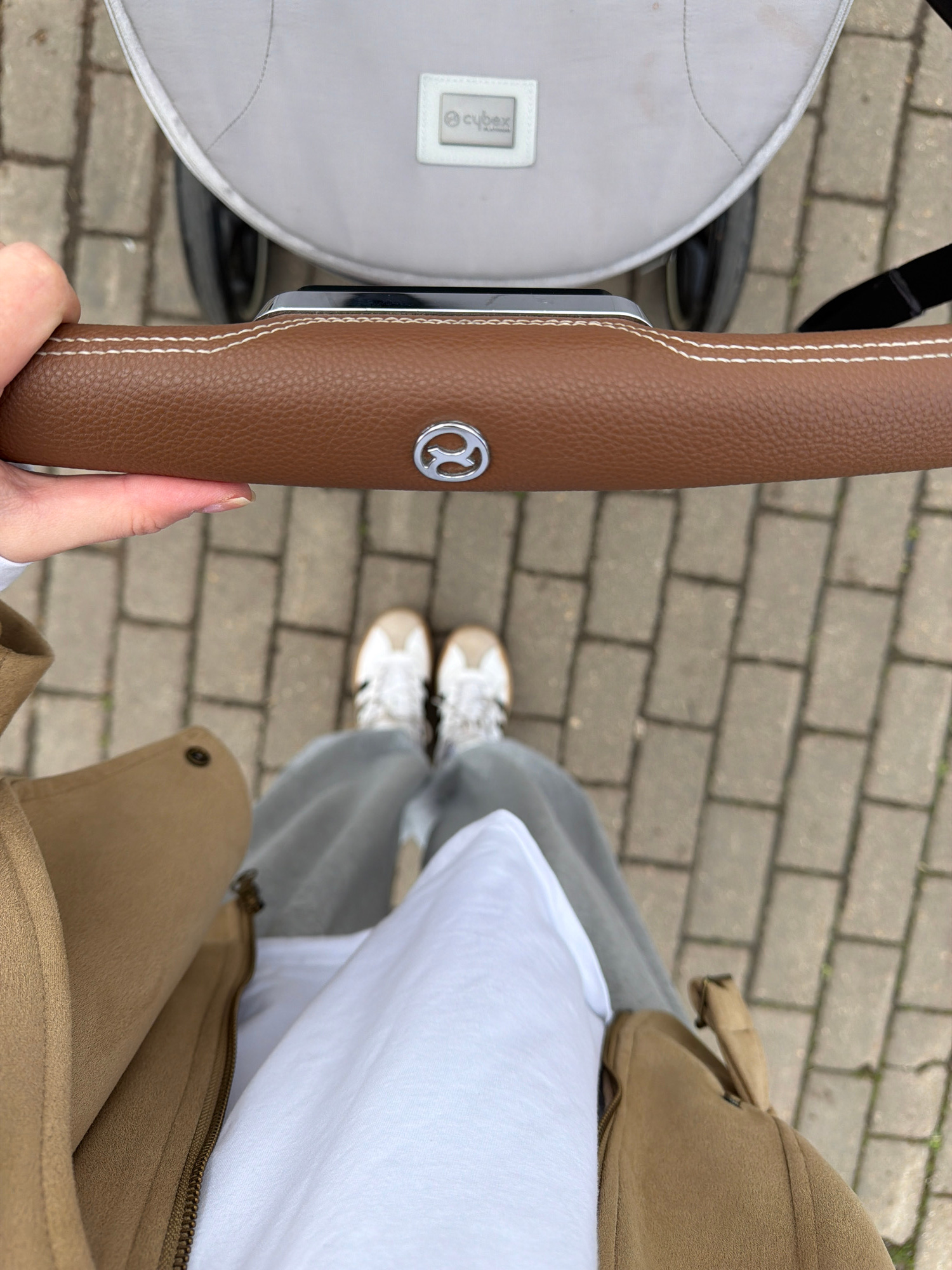 The image presents an overhead, first-person perspective of a person pushing a stroller outdoors. The scene focuses on the stroller's handle, the person's attire, and the paved ground. In the foregro…read more