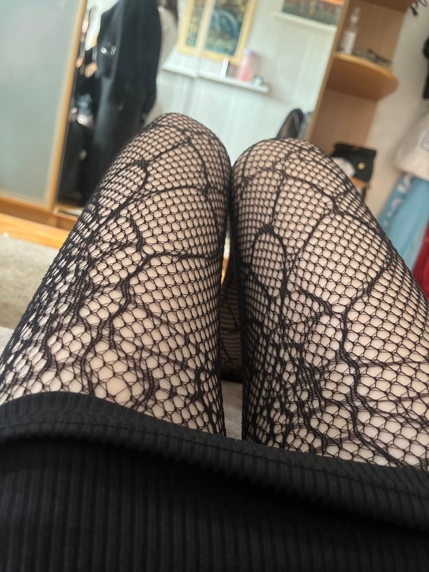 The image presents a close-up view of a person's legs, covered in black patterned mesh tights that feature an intricate, irregular net-like design over light-toned skin. A dark, possibly black, ribbed…read more
