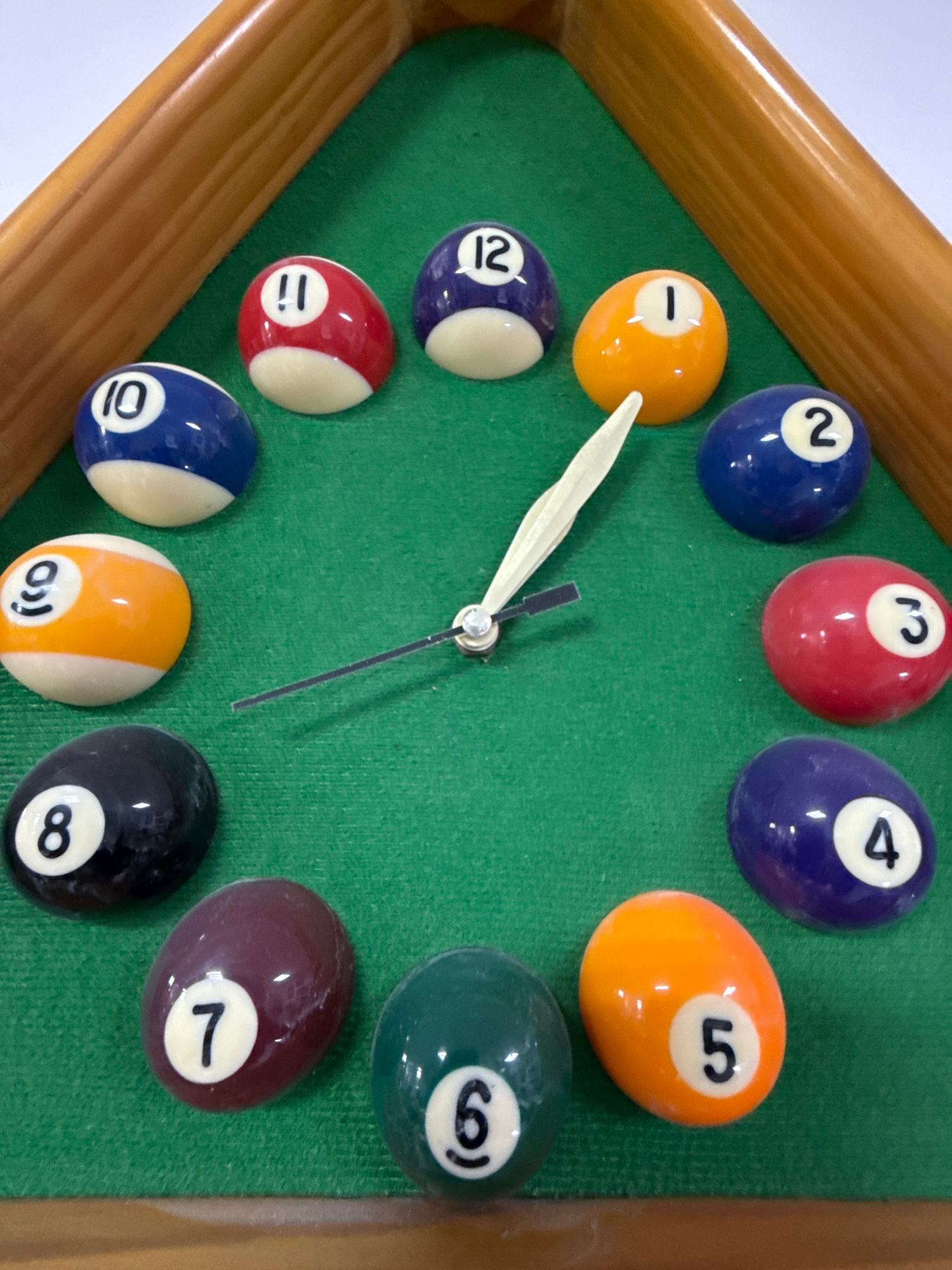 A top-down shot shows a clock made from a miniature pool table with billiard balls marking the hours. The table has a wooden frame and green felt surface. The balls are arranged in a circle, with the…read more