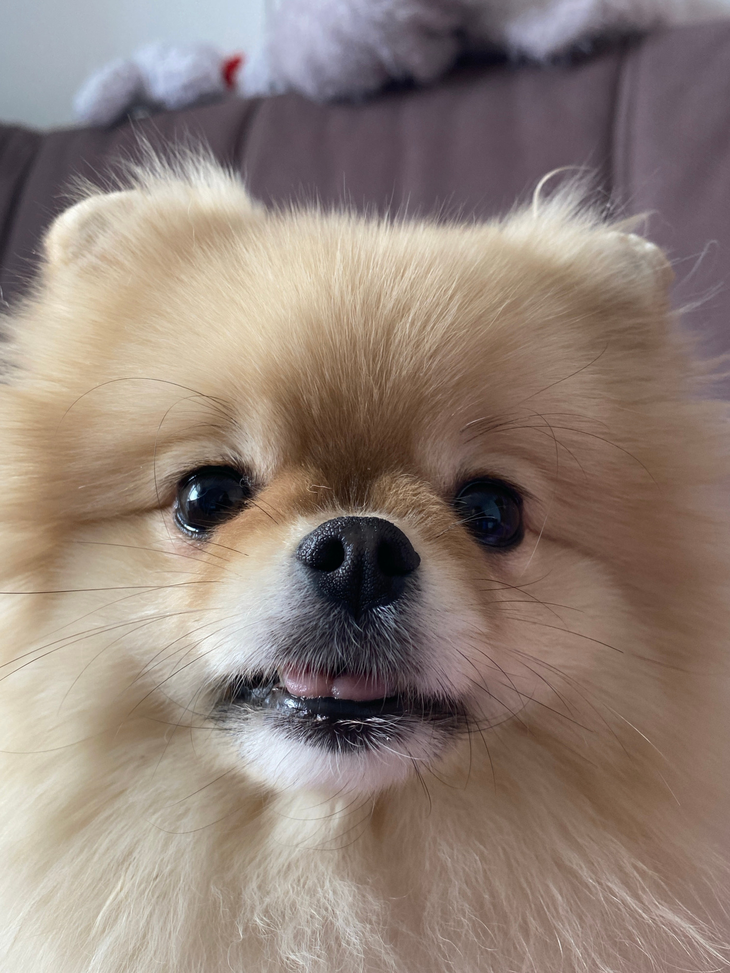 The image depicts a close-up of a tan Pomeranian dog's face, angled slightly. The dog has dark, glossy eyes and a black nose. A small portion of its tongue is visible. The background appears to be a sβ¦read more