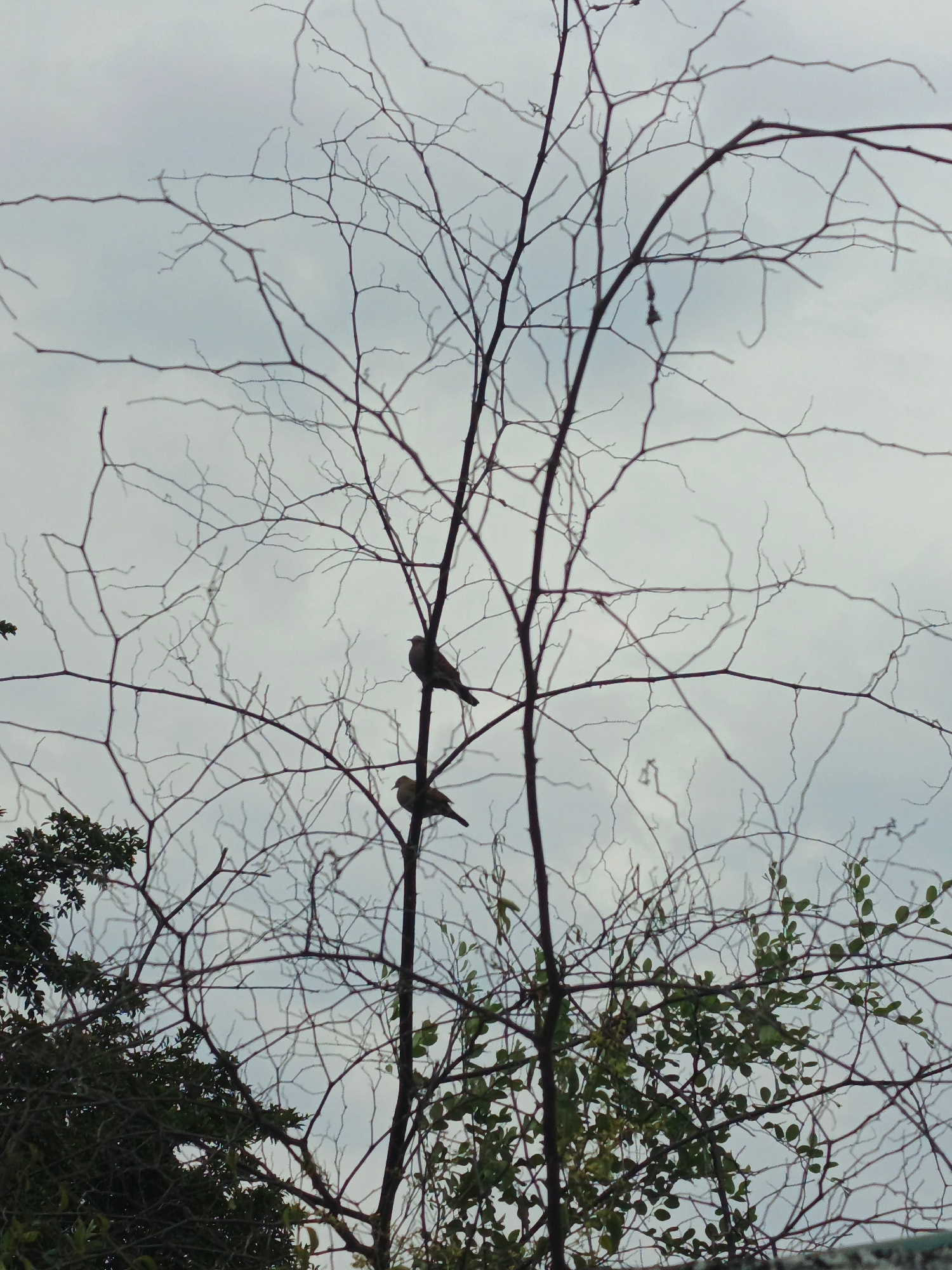The image shows two birds perched on the branches of a bare tree. The tree is in the foreground, set against a backdrop of a cloudy sky. There is vegetation in the lower part of the image. The locatio…read more