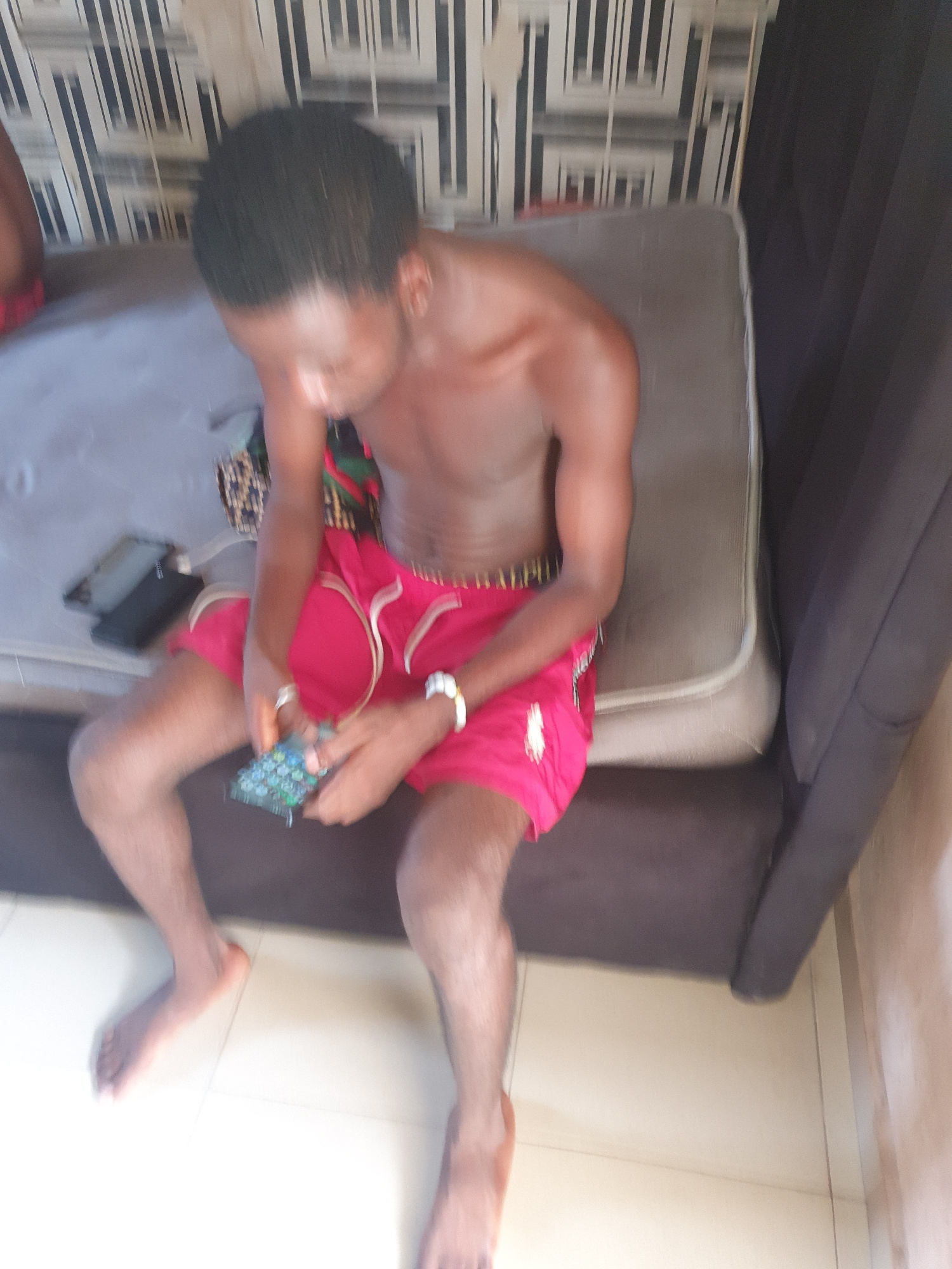 A person is lying on a couch. The person is wearing red shorts and holding a phone. The couch is next to a wall with a patterned design. The setting is likely indoors. There is a second phone on the c…read more