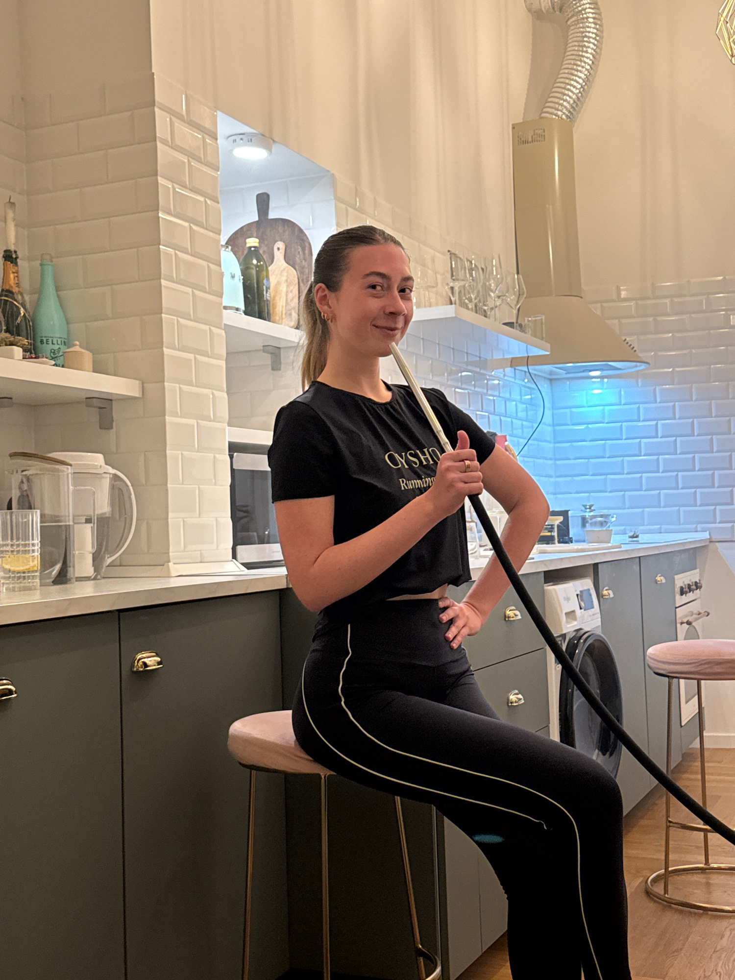 A woman is posed in what appears to be a kitchen, holding a long, white stick. She is wearing a black cropped t-shirt and black leggings with white stripes. The kitchen has white tiled walls and gray…read more