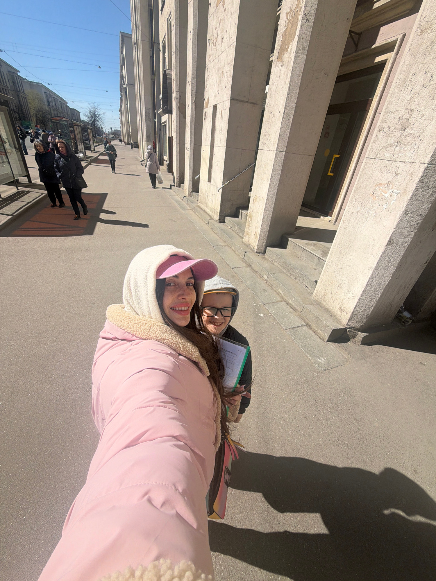 This image captures two young women posing cheerfully on a sunny city street in Saint Petersburg, Russia. The photo, taken at close range, appears to be a casual outdoor snapshot or selfie. In the fo…read more