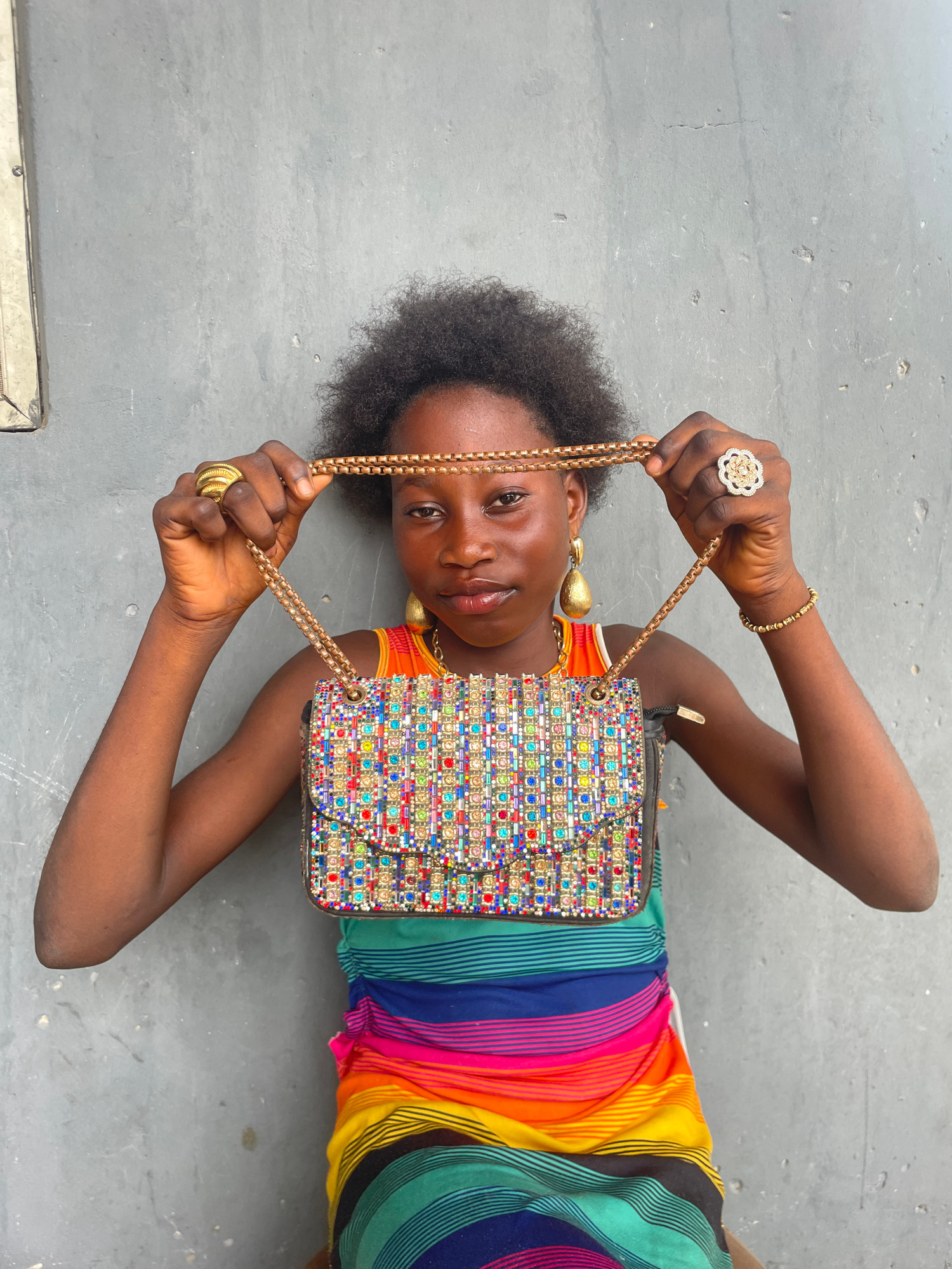 A young person with dark skin and dark, curly hair is depicted lying on their back on a textured grey surface, which appears to be concrete ground. Their head is tilted, and they are looking directly…read more