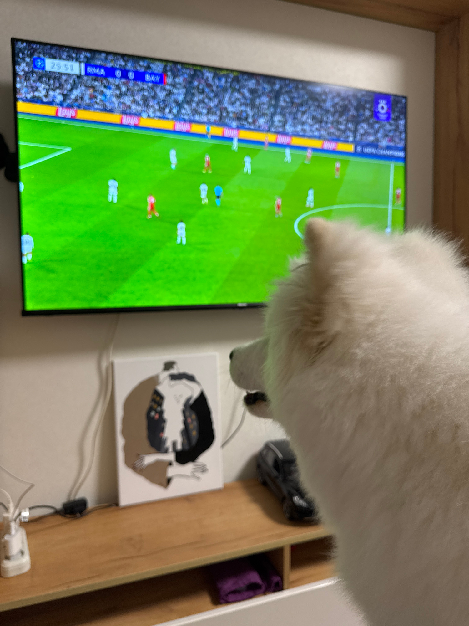 The image shows a television displaying a soccer game. The TV is mounted on a wall above a painting of a person lying down. A white dog is in the foreground, partially obscuring the view. The location…read more