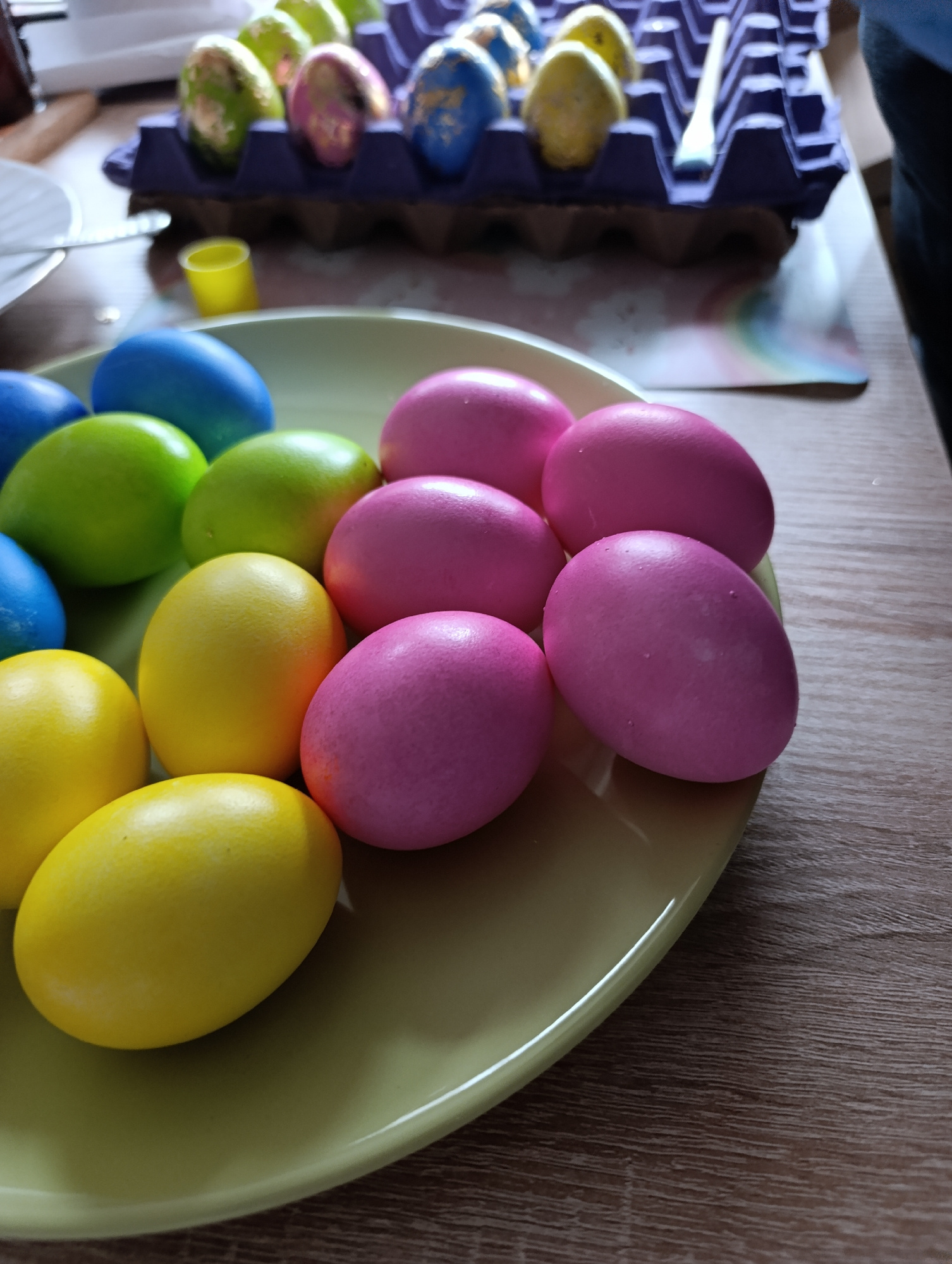 A high-angle shot depicts a green plate filled with Easter eggs, colored blue, green, yellow, and pink. An egg carton filled with more decorated Easter eggs is visible in the background. The backgroun…read more