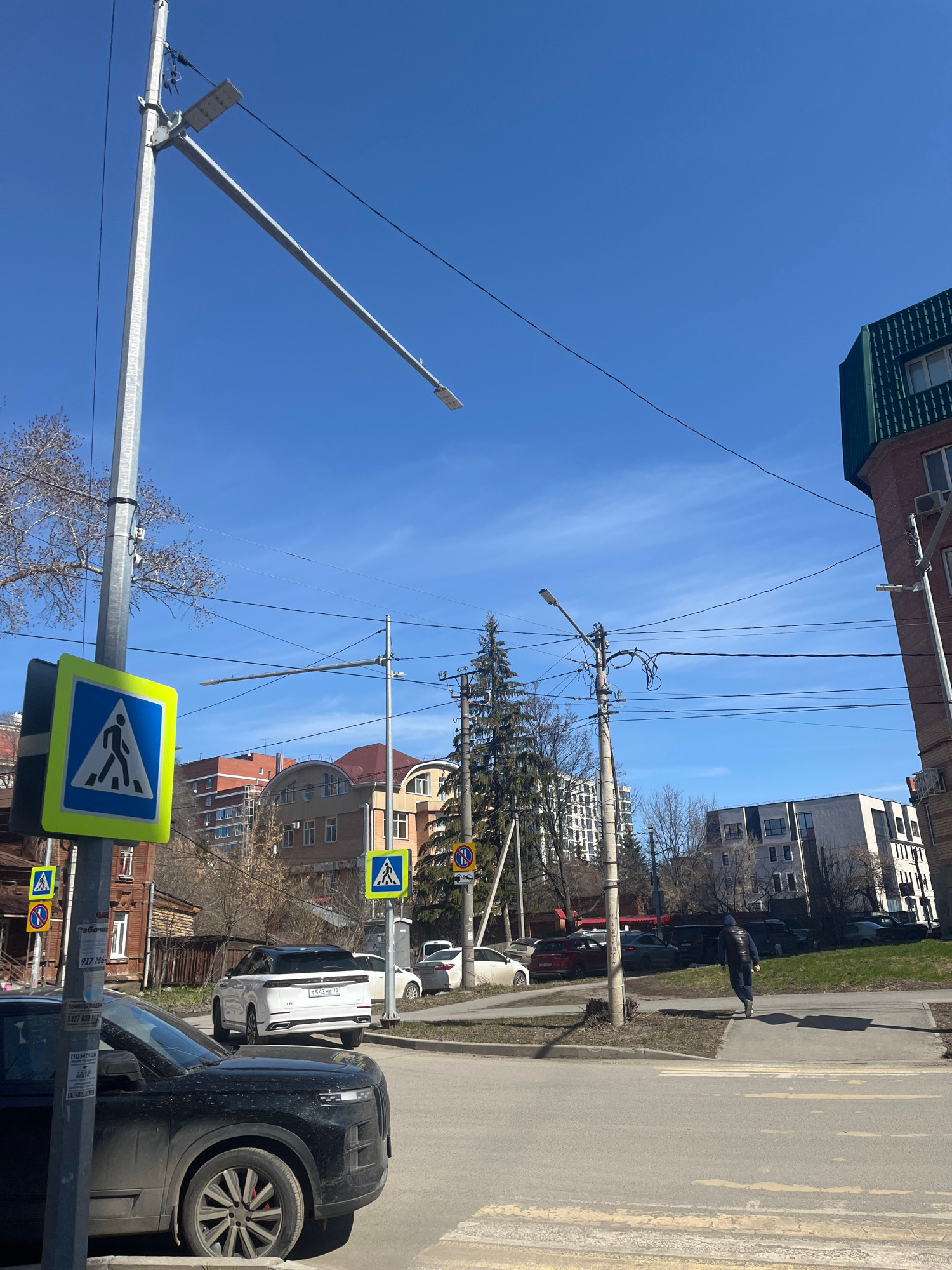 A street scene in Ulyanovsk, Russia, shows a bright blue sky above buildings, utility poles with wires, and street signs. The street has parked cars on the right side. A person walks along the sidewal…read more