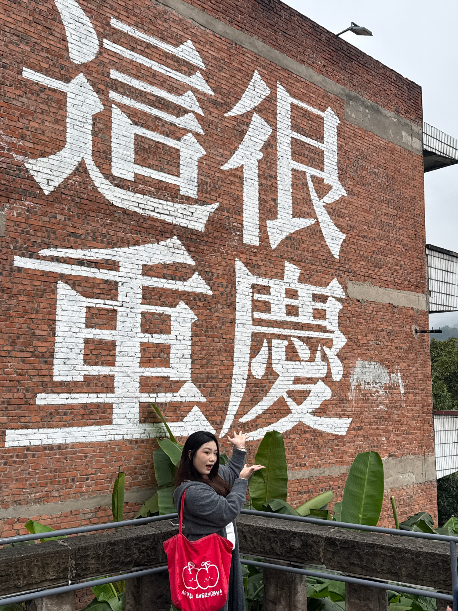 A young East Asian woman, dressed in a grey hooded cardigan over a white top and dark lower garments, poses with a red "APPLE EVERYDAY!" tote bag on her left shoulder. She stands smiling with both han…read more
