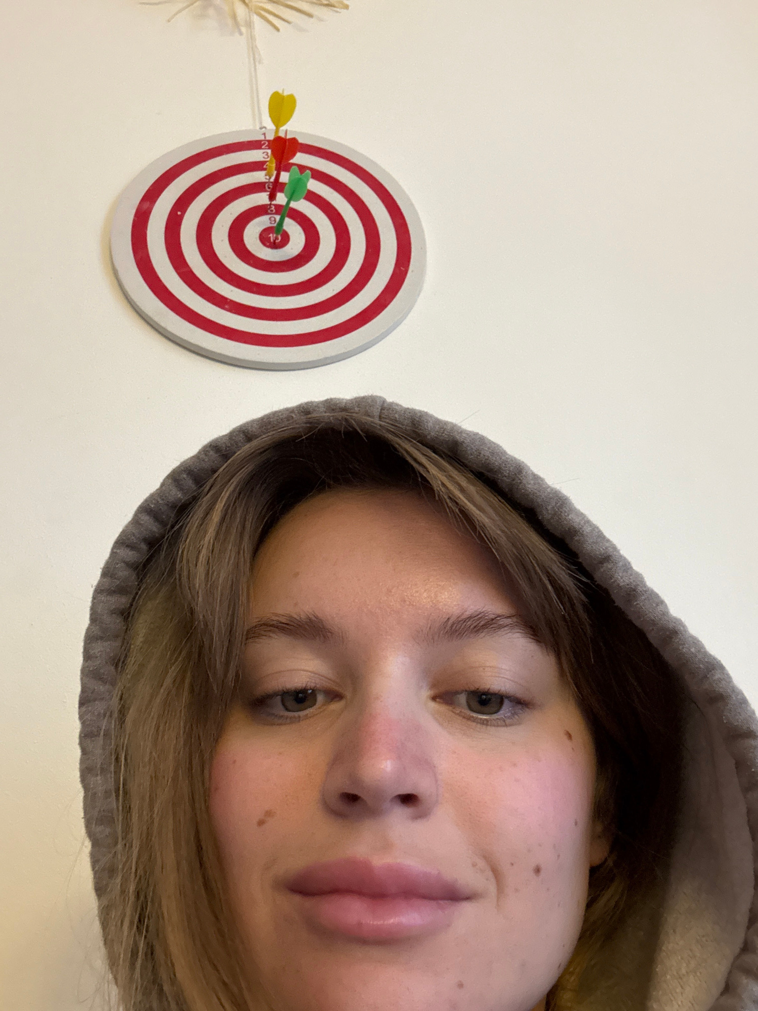 A close-up, slightly angled photograph shows a person and a dartboard. The person, likely female, has fair skin, light brown hair, and is wearing a gray hooded sweatshirt. The hood is up, framing the…read more