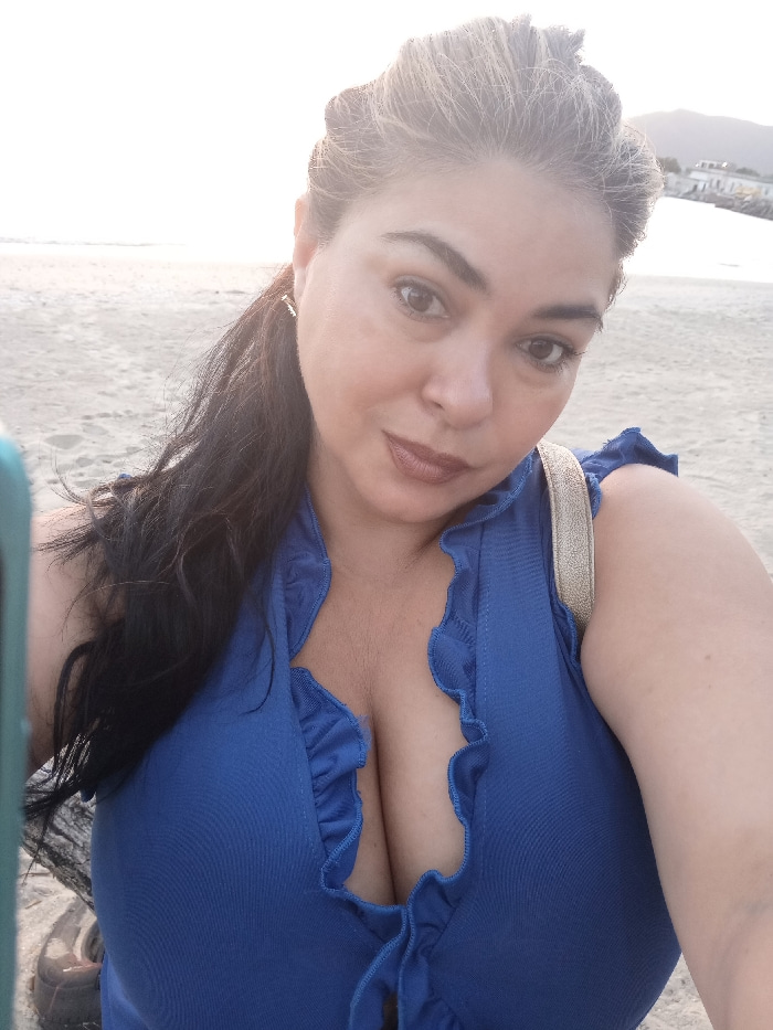 The image displays a waist-up portrait of a single female individual positioned in the foreground at a beach location in Juan Griego, Venezuela. The woman, appearing to be middle-aged, has long, darkβ¦read more