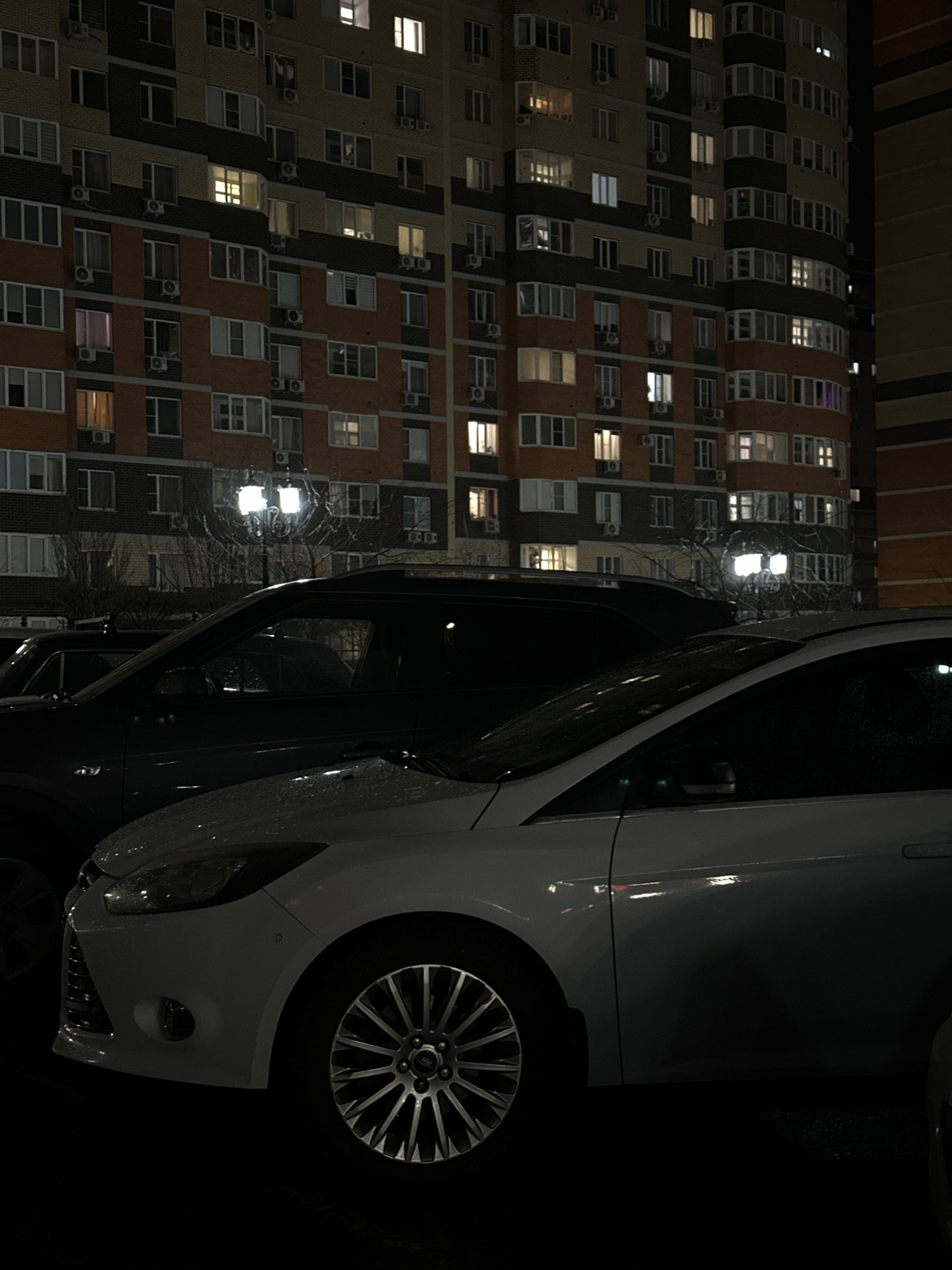 A nighttime photograph depicts a car parked in front of a multi-story apartment building, likely in Kuleshovka, Russia. The building is constructed with light-colored materials and features a pattern…read more