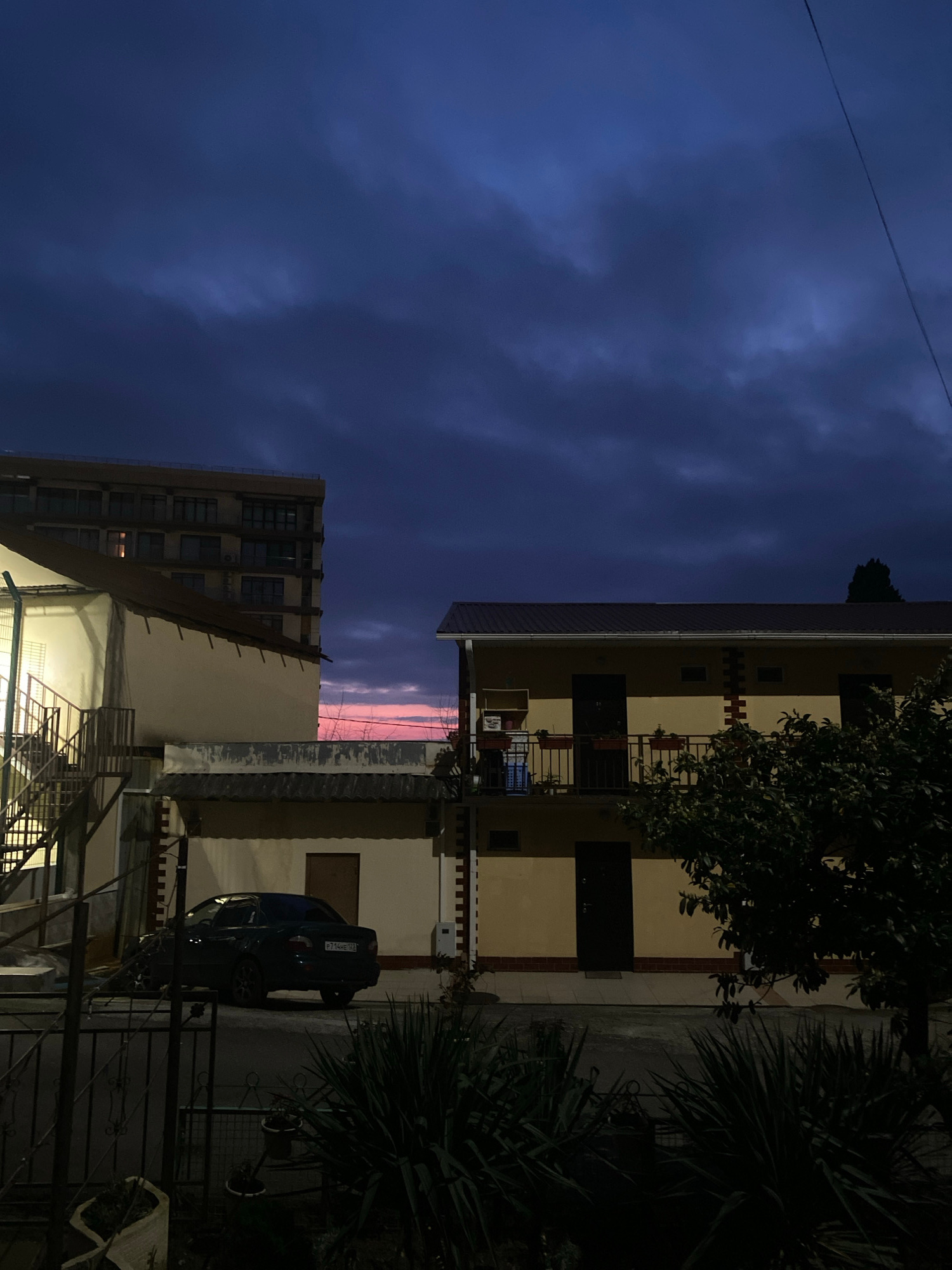 The image shows an urban scene, likely in Sochi, Russia, based on architectural styles and a license plate partially visible on a dark-colored car parked near a building. Two multi-story buildings fra…read more