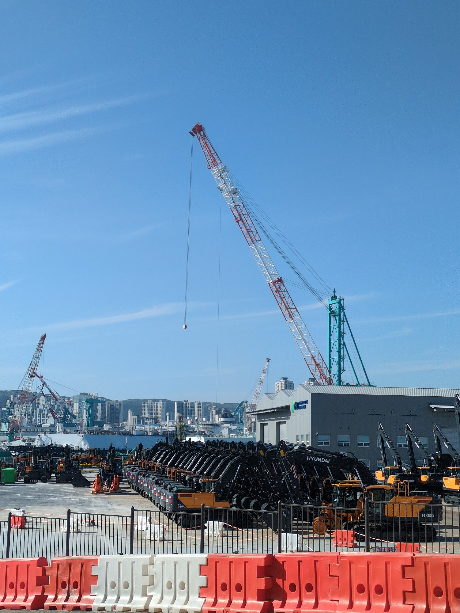 The image depicts a port scene in Ulsan, South Korea, dominated by cranes and construction equipment. The sky is clear blue. Multiple large cranes, some painted red and white, others green, are visibl…read more