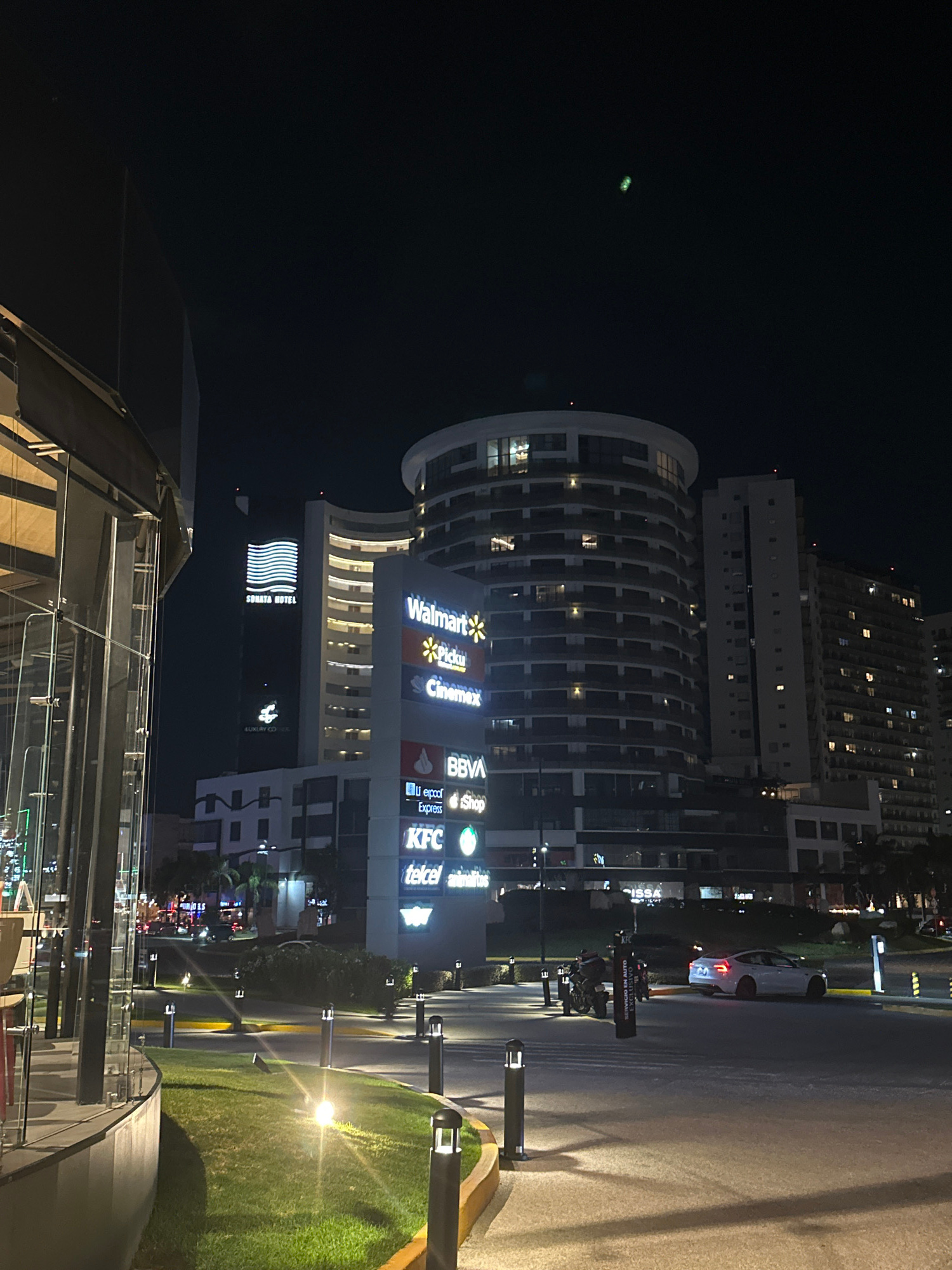 At night in San Bernardino Tlaxcalancingo, Mexico, a tall building displaying a vertical sign including “Walmart,” “PickUp,” “Cinemex,” “BBVA,” and “KFC” is visible, along with other buildings includi…read more