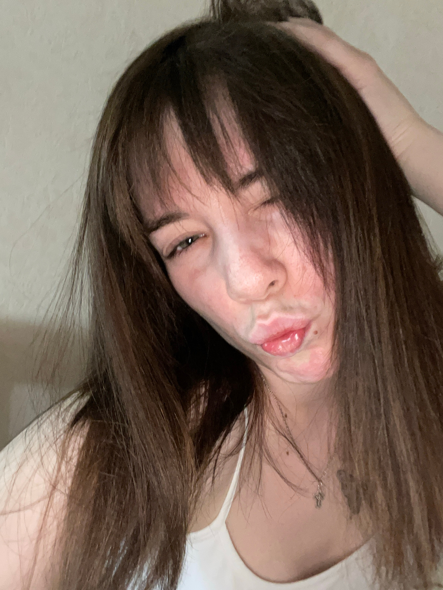 A young woman with long, dark brown hair is positioned diagonally in the frame. Her head is tilted towards the left, and she is partially obscured by her hair, which falls across her face. Her left ey…read more