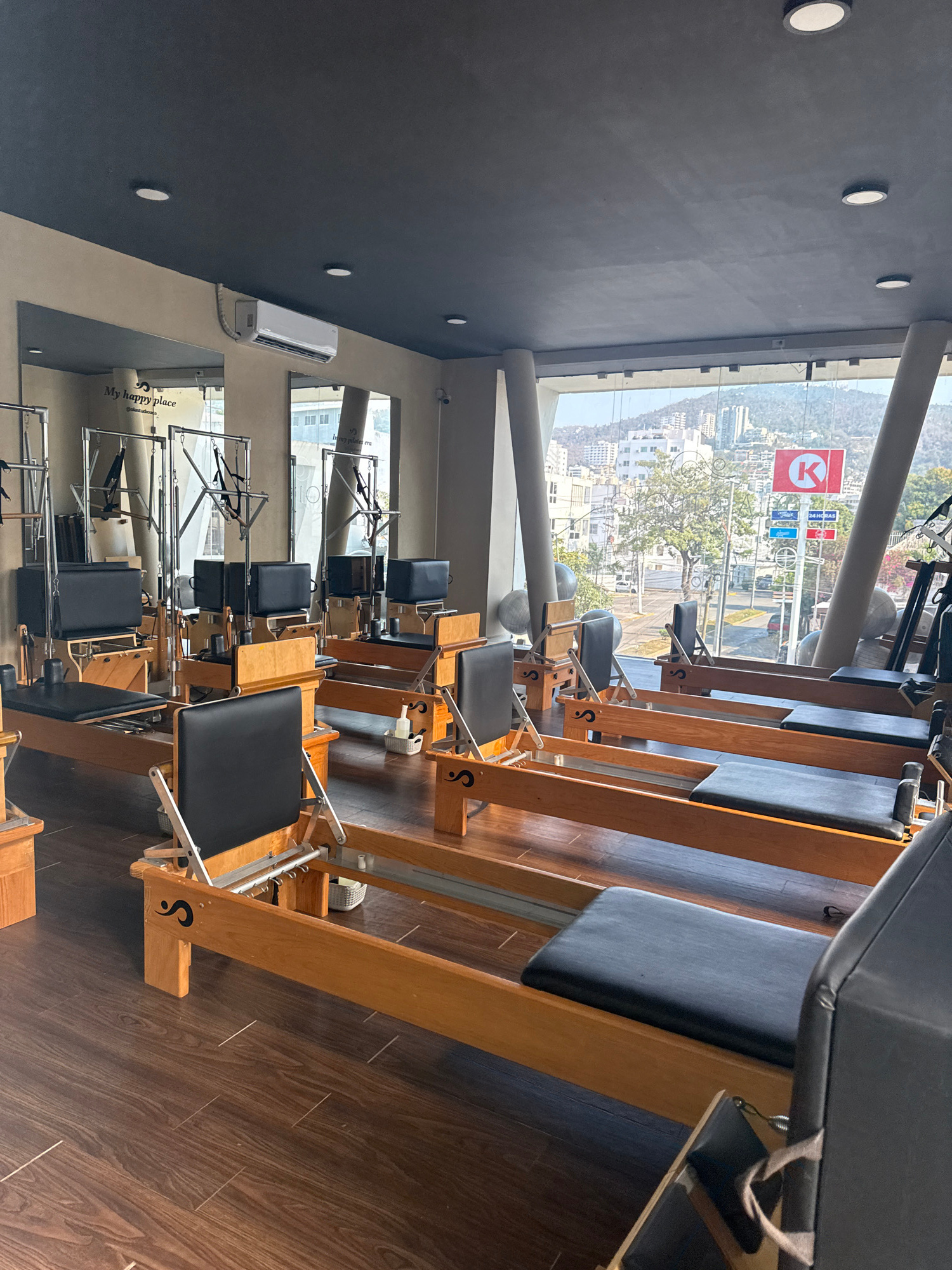 Acapulco, Mexico: Interior view of a pilates studio. Pilates reformers are lined up in a row, the wood and black upholstery contrasting with the dark ceiling and light walls. Large windows offer a vie…read more