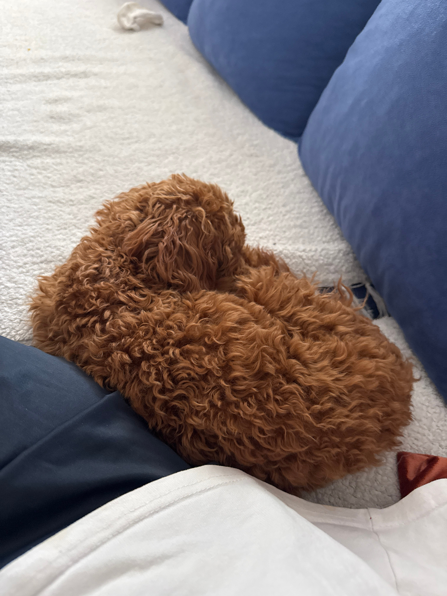 A brown, curly-haired dog is curled up on a white, textured surface, likely a bed or couch, next to blue cushions and clothing. The location is not discernible from the image.