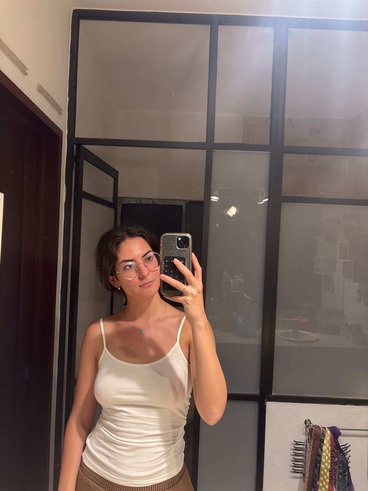 A person with short, dark hair and wearing round glasses is holding a smartphone in their right hand, taking a selfie in front of a large mirror. The person is wearing a white tank top and a necklace…read more