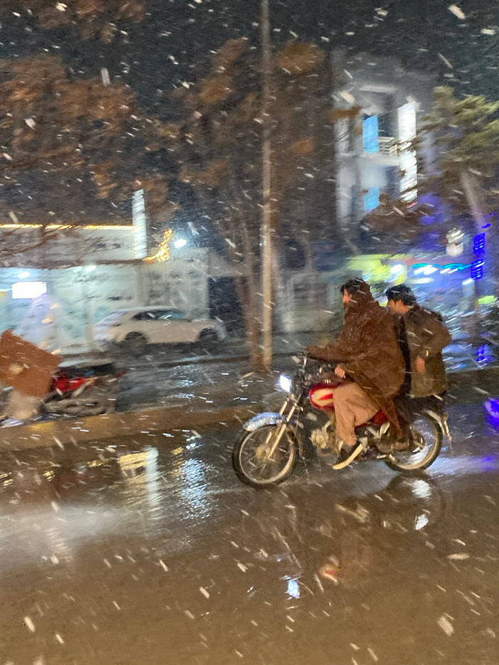 Two individuals on a motorcycle traverse a snow-covered urban landscape. They are dressed in brown jackets. The motorcycle has a red seat. Snow falls heavily, obscuring the surroundings. Buildings and…read more