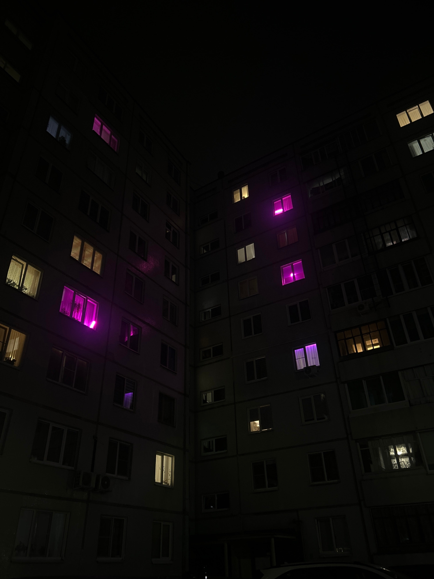 A low-angle, eye-level photograph captures a dimly lit apartment building at night, potentially located in or near Chaikovsky, Russia. The building is characterized by multiple rows and columns of win…read more