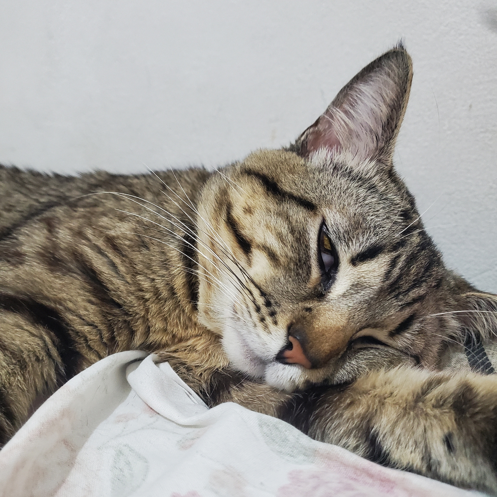 A close-up, angled shot features a brown tabby cat resting against a white fabric with a subtle floral pattern. The cat's head occupies a large portion of the frame, with its left ear visible and upri…read more