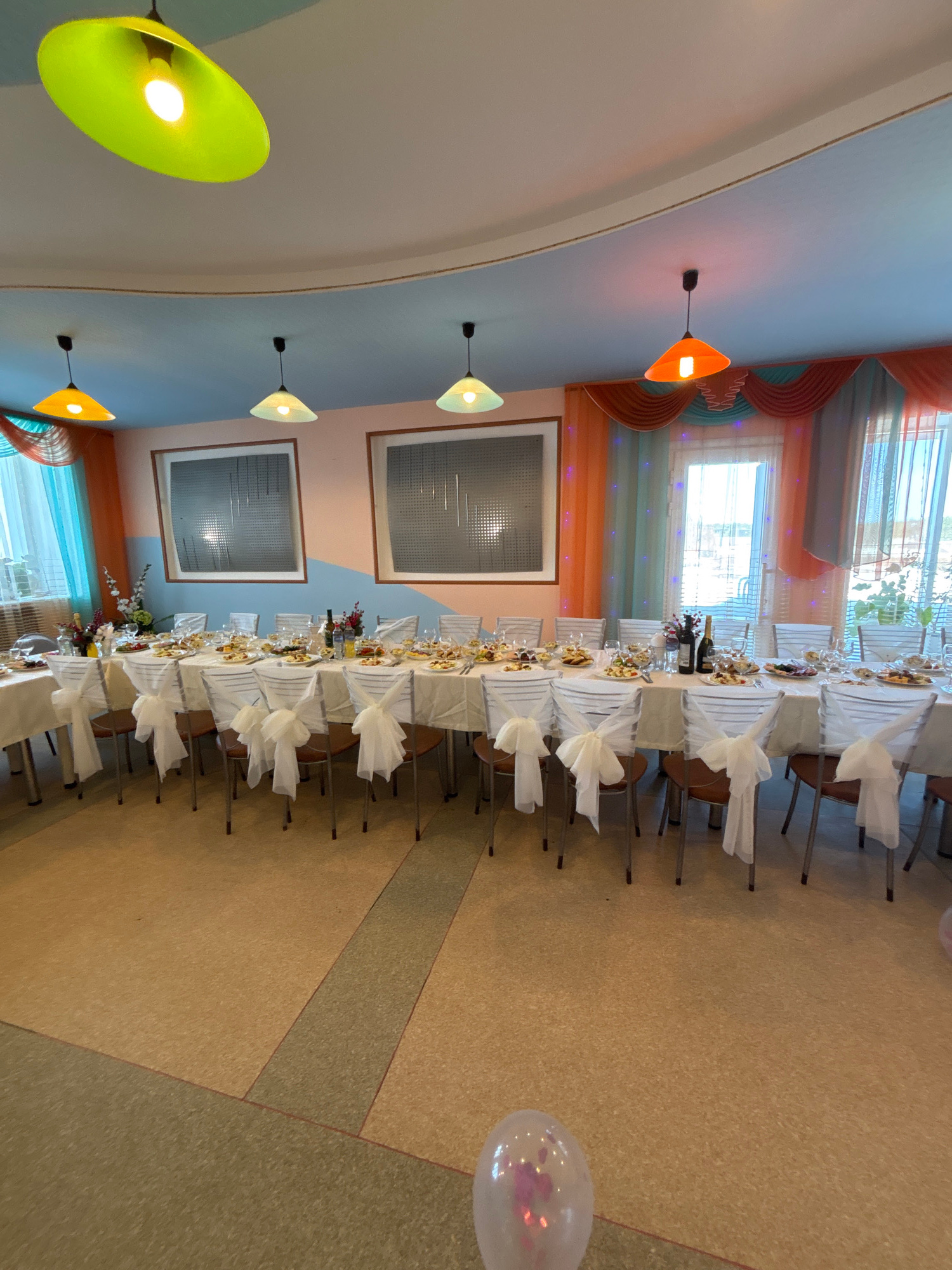 The image depicts an unoccupied interior room, likely a banquet hall or event space, set up for a formal gathering in the city of Foki, Russia. The specific venue within Foki is not identifiable from…read more