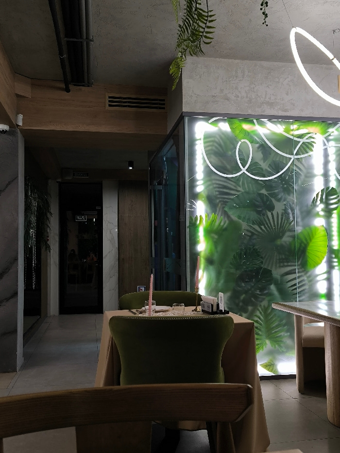 A restaurant's interior with a green theme. A table draped with a beige cloth and olive-green chairs stands near a glass-enclosed wall adorned with green foliage and white neon lights. In the background, a doorway reveals a glimpse of other patrons. Overhead, fern-like plants hang from the ceiling, and modern, circular lighting fixtures add to the ambiance. The overall aesthetic is modern and inviting. | Open Wire