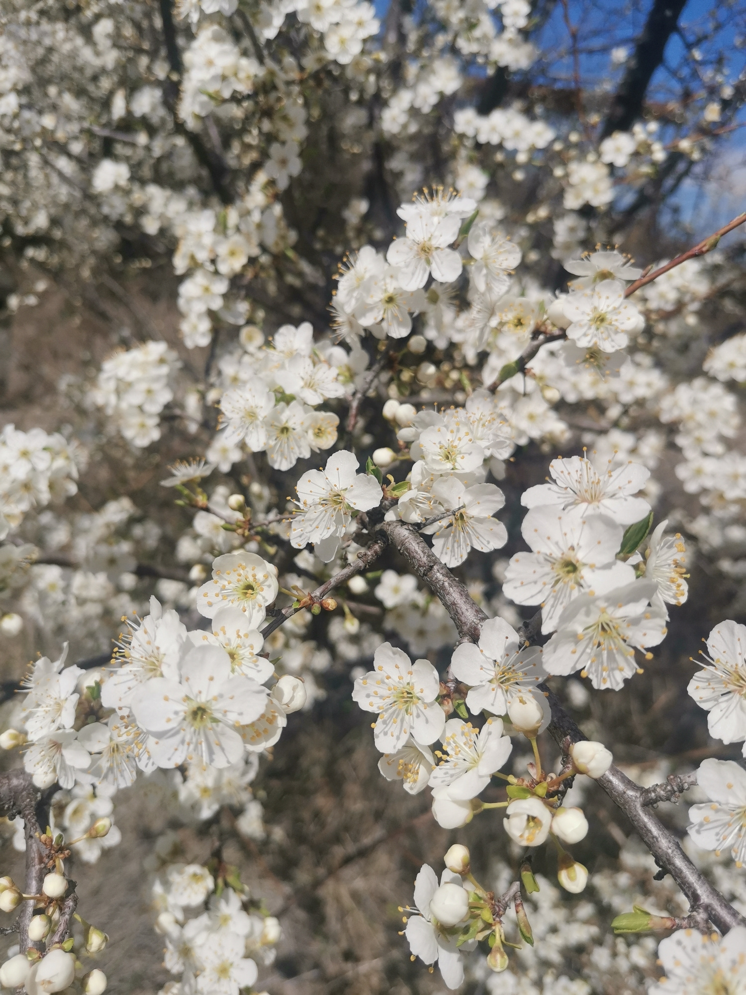 The image shows a close-up view of flowering branches, densely packed with white blossoms. The flowers have five petals and prominent yellow stamens. Some buds are also visible. The background is a mi…read more