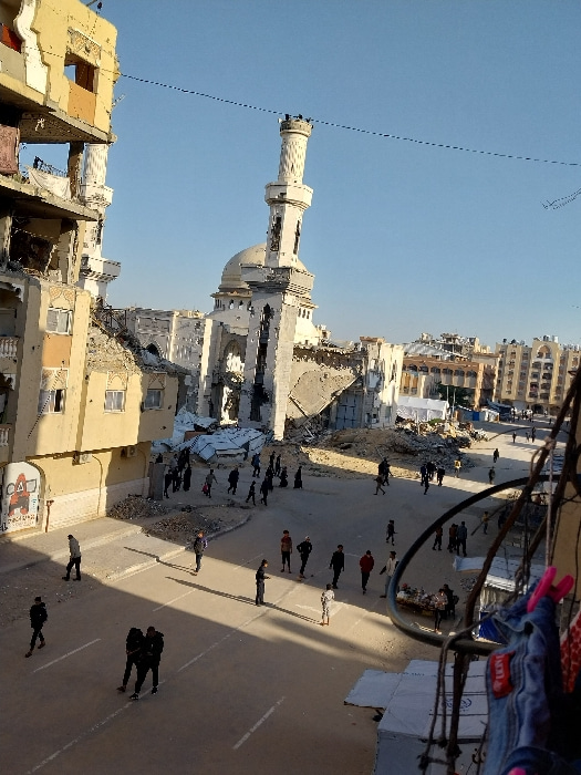 This image depicts a street scene in Khan Yunis, Palestinian Territory, characterized by extensive structural damage under a clear blue sky. In the mid-ground, a large mosque stands partially destroy…read more