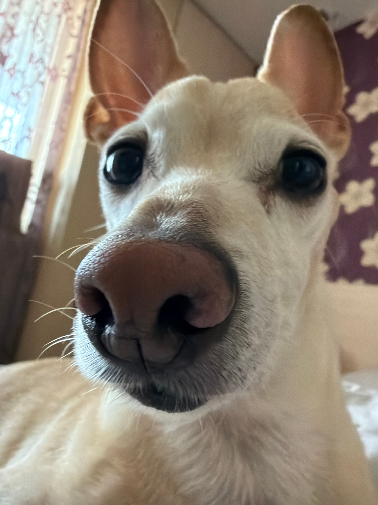 This is an extreme close-up, low-angle photograph of a light-colored dog's face, likely taken indoors in a residence in Plovdiv, Bulgaria. The dog, possibly a cream-colored Labrador or similar breed,…read more