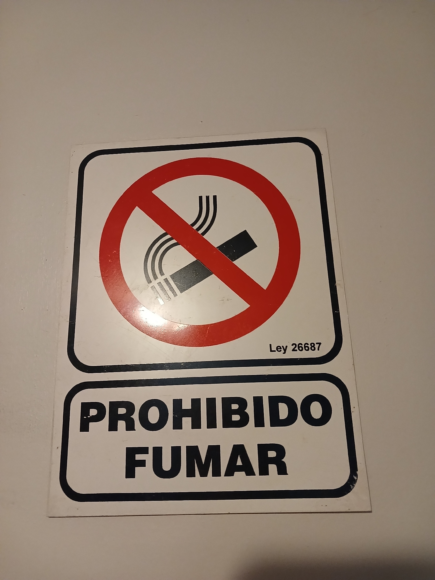 A close-up, slightly angled shot captures a rectangular "No Smoking" sign affixed to a plain, light-colored wall. The sign is divided into two sections. The left section prominently displays the unive…read more