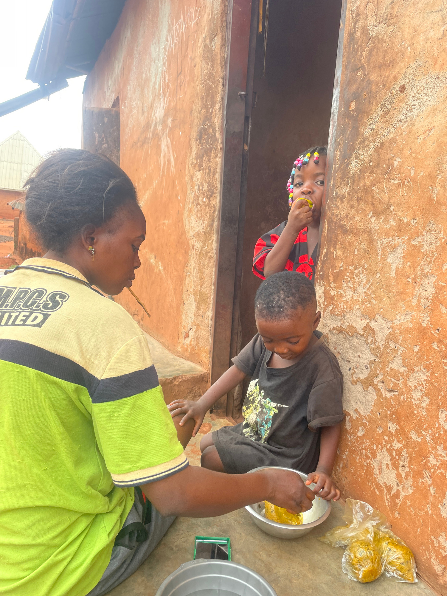 The image shows an outdoor scene in Ogbe, Nigeria. A woman wearing a green and yellow shirt with the inscription "NPGS UNITED" is seated, holding a thin, light-colored stick in her mouth. A young boy…read more