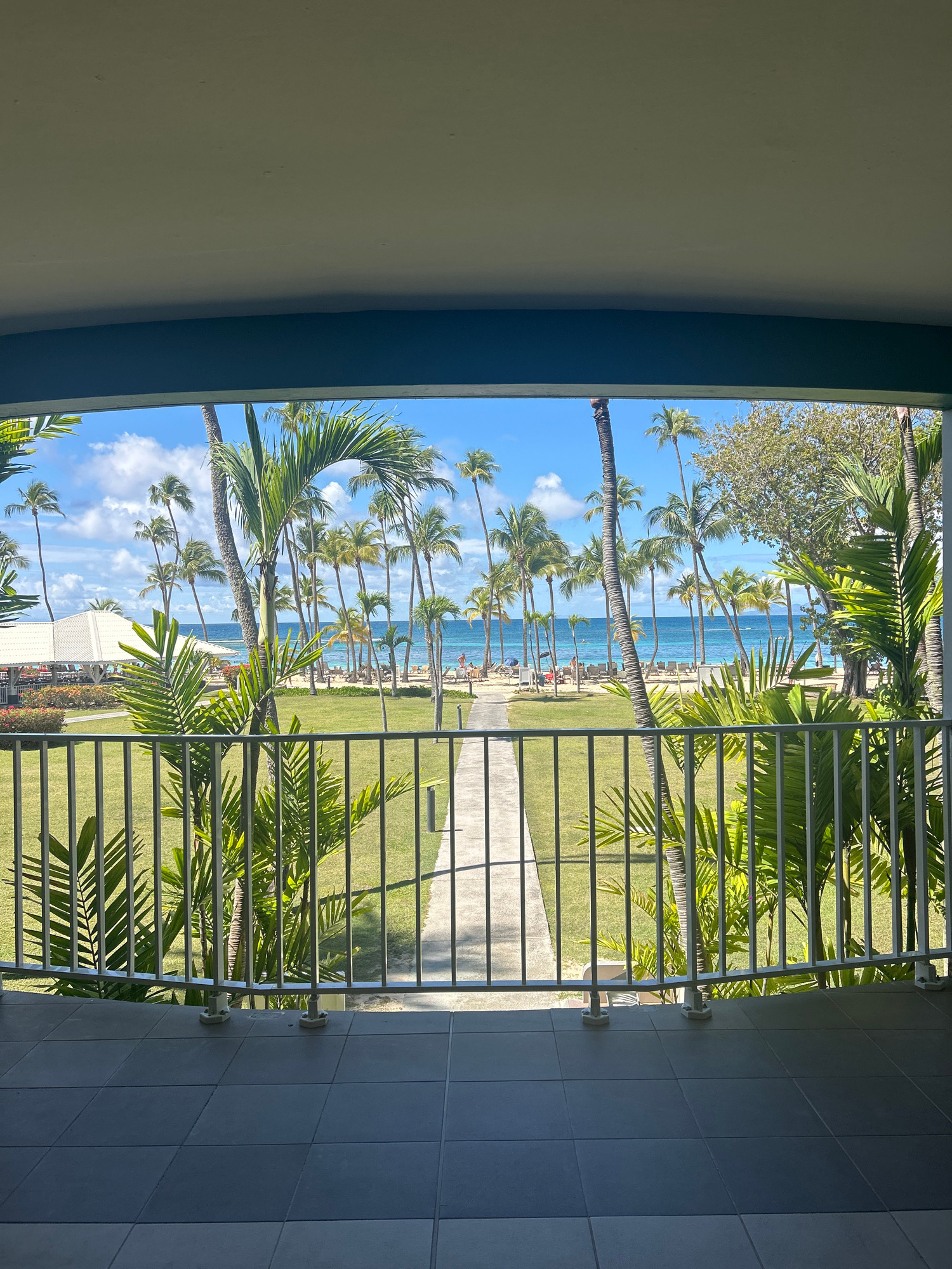 The image is a view from a balcony overlooking a beach in Sainte-Anne, France. The balcony has a white metal railing. Beyond the railing, there is a grassy area with a concrete walkway leading towards…read more