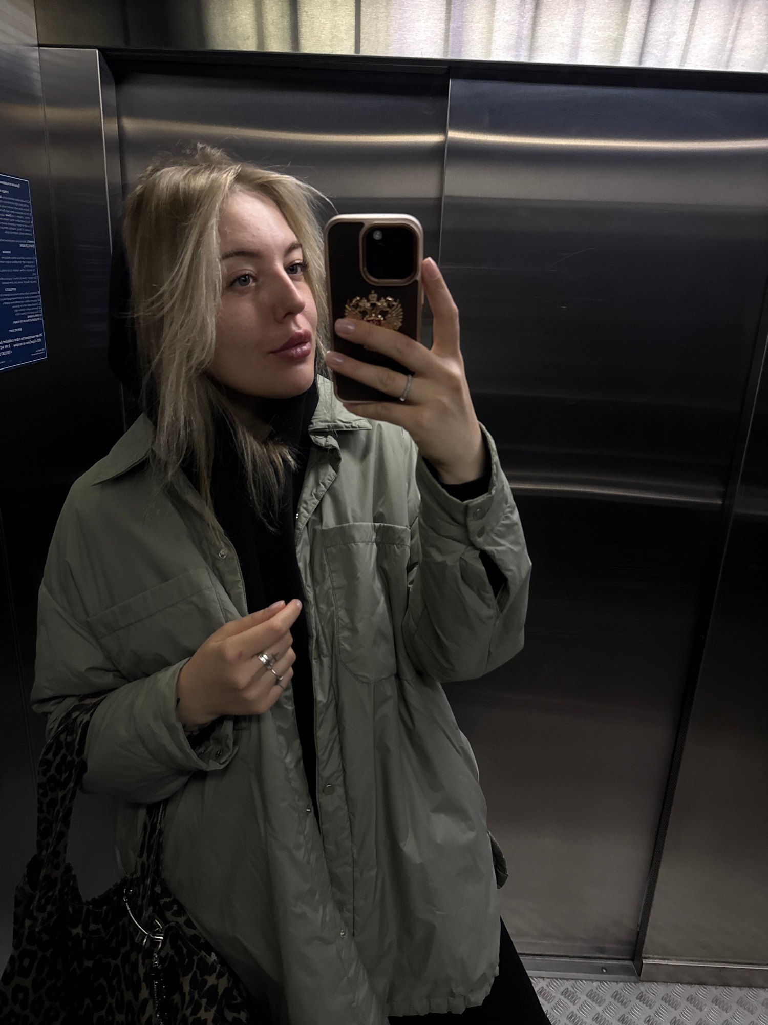 A woman with blonde hair is taking a selfie in an elevator. She is wearing a light green puffer jacket over a black top, and a leopard print bag is visible. The elevator has stainless steel walls. A s…read more