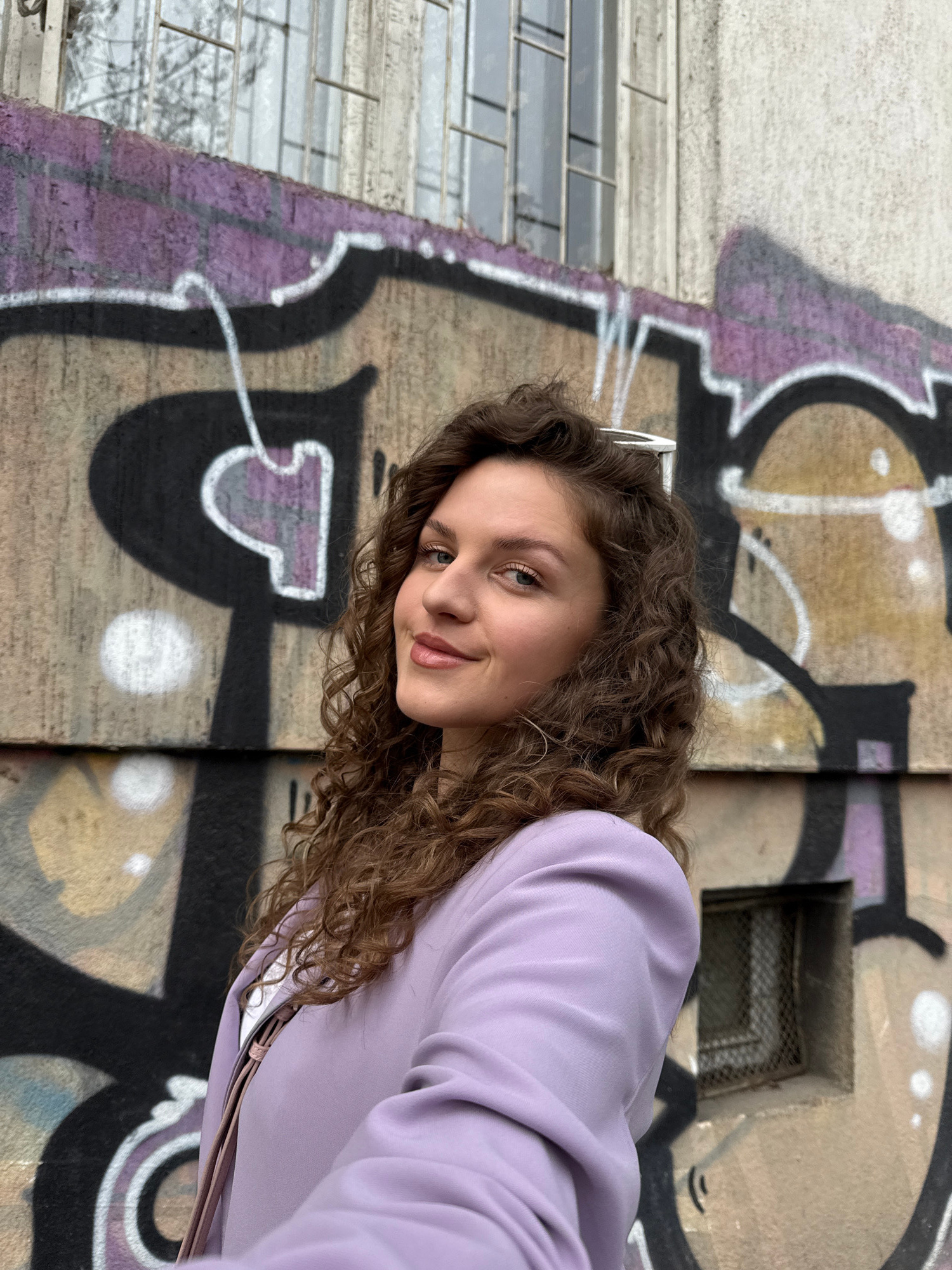 A young woman with long, curly brown hair and light purple blazer takes a selfie, her head tilted to the side, against an urban backdrop in Sofia, Bulgaria. She looks directly at the camera with a sub…read more
