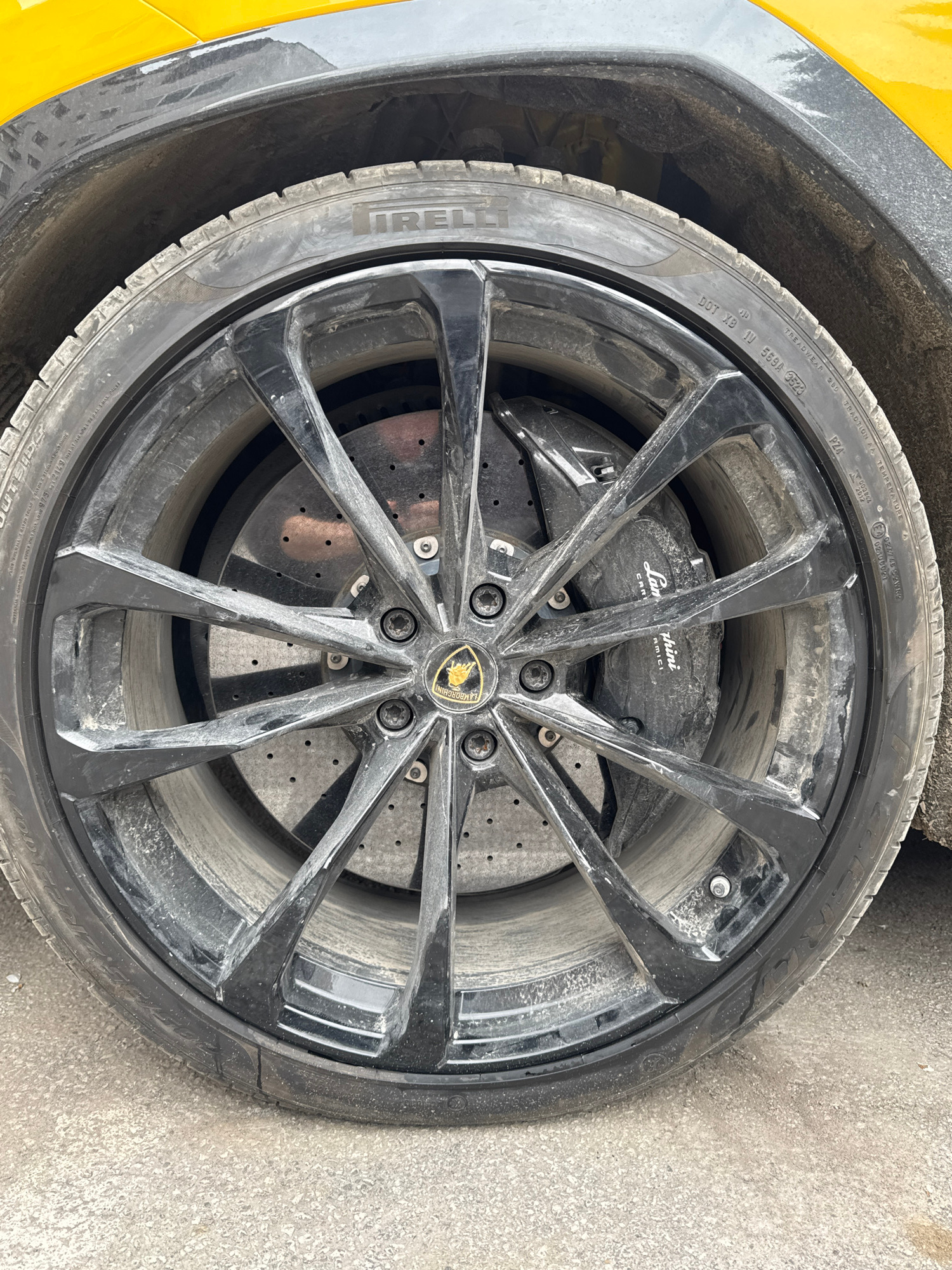 A close-up, eye-level shot captures a dirty black multi-spoke wheel and tire belonging to a yellow Lamborghini, set against a grey, textured ground in Plovdiv, Bulgaria. The wheel is covered in a sign…read more