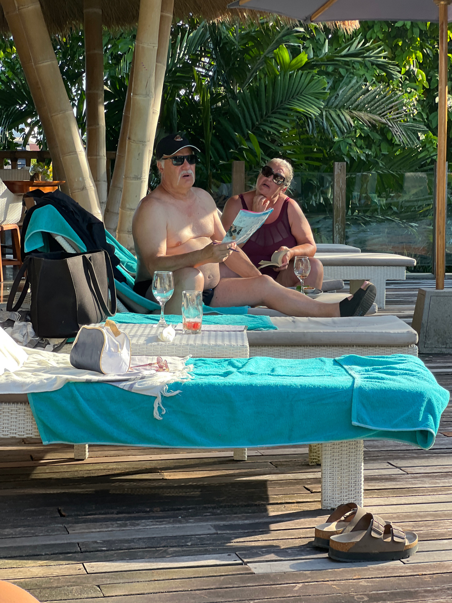 Two people are relaxing on lounge chairs outdoors in North Kuta, Indonesia. One person is wearing a black cap and sunglasses, and they are holding a book. The other person is wearing sunglasses and a…read more