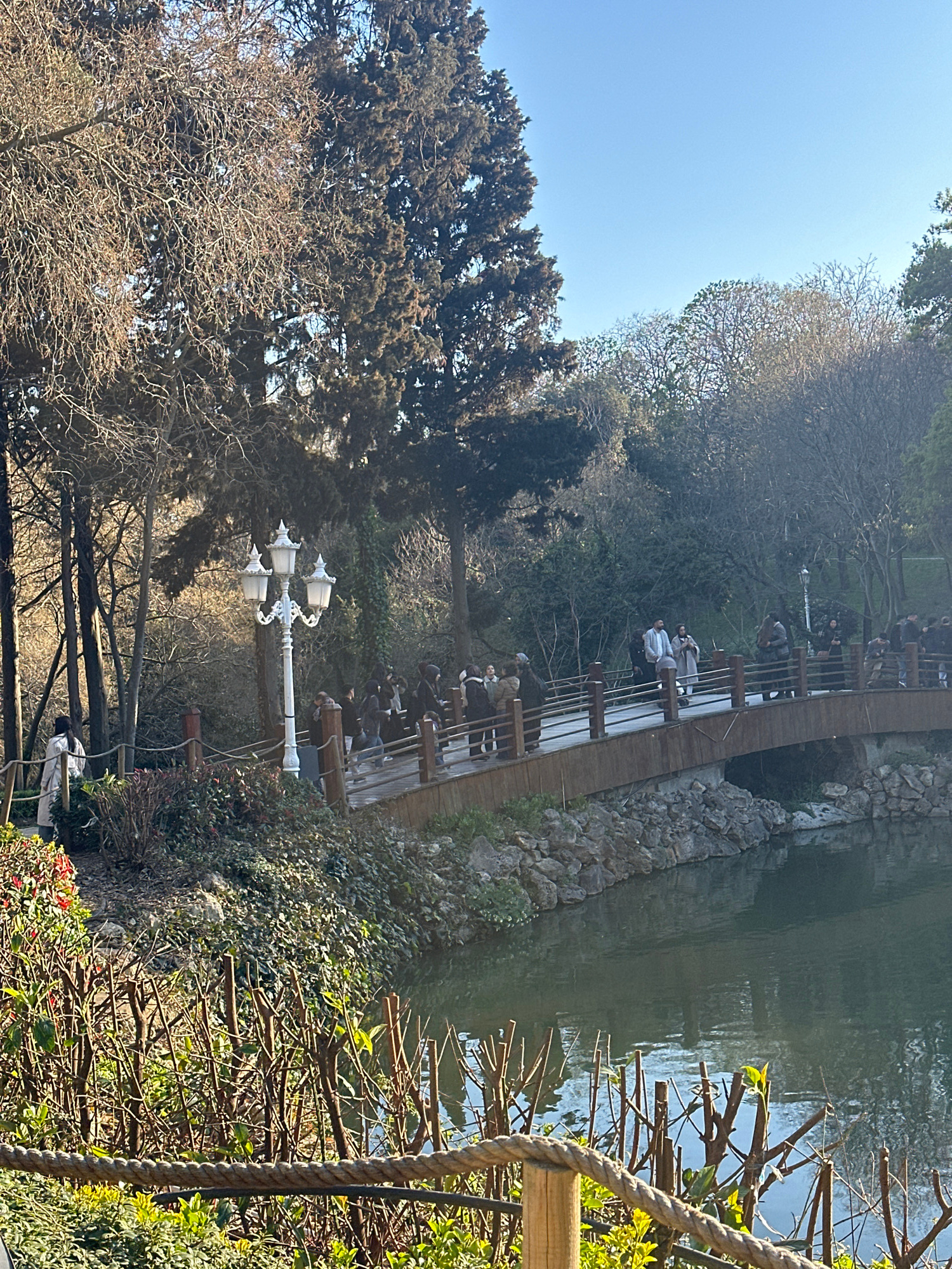The photograph shows a scene in Beşiktaş, Turkey, likely in a park or garden setting adjacent to water. People are present on a raised wooden walkway, appearing to be walking along or pausing to look…read more