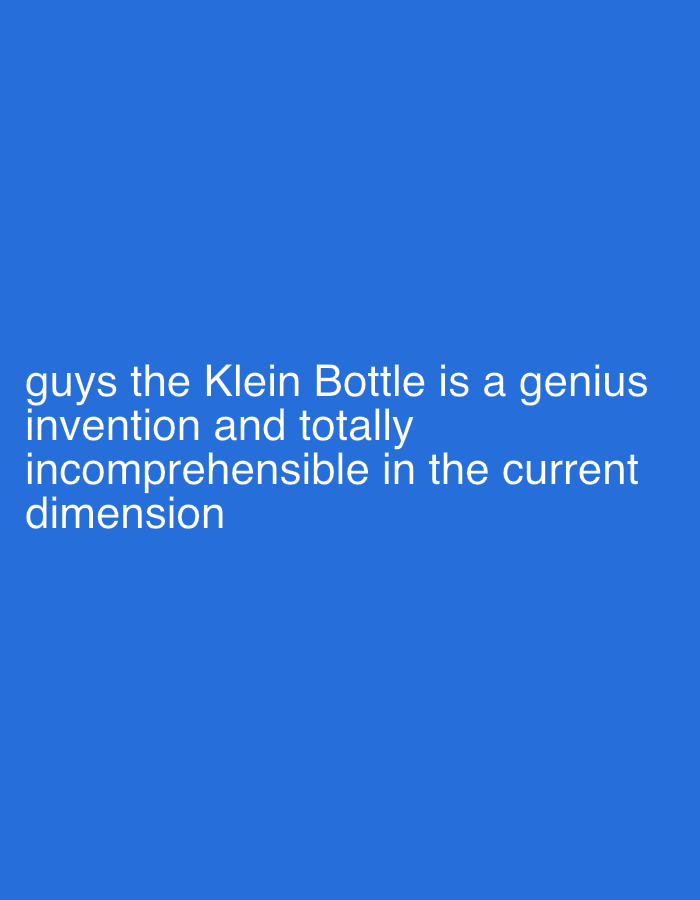 The image contains text on a blue background. The text reads "guys the Klein Bottle is a genius invention and totally incomprehensible in the current dimension."