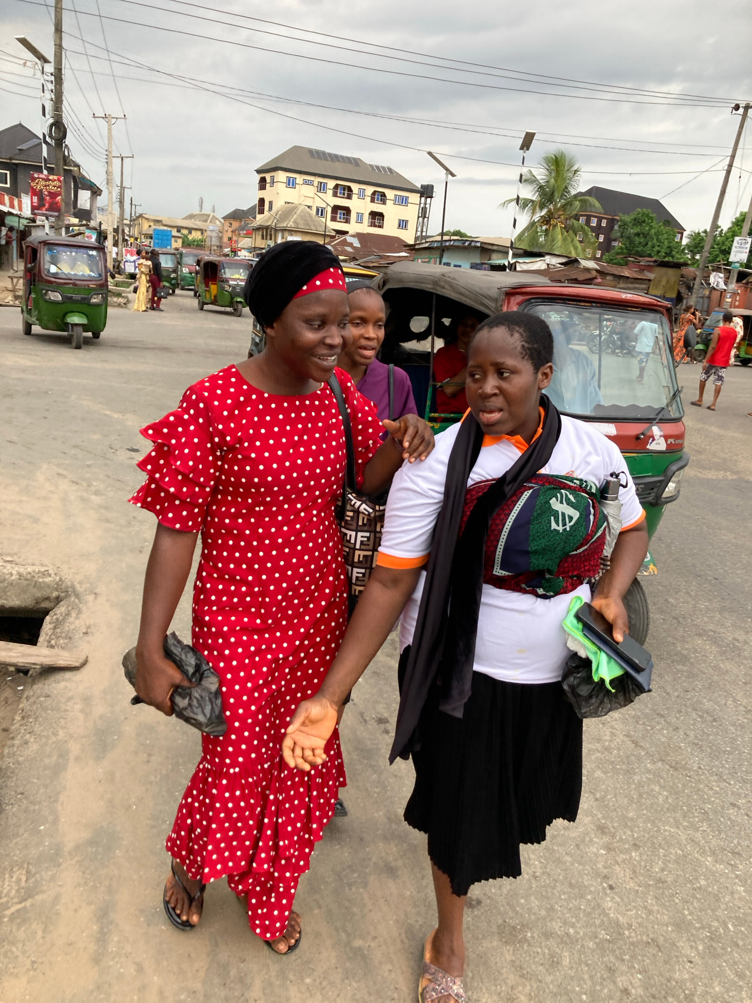Two women stand close together on a paved street in what appears to be Aba, Nigeria. One woman, in the foreground, wears a red dress with white polka dots and a black head covering. She is carrying a…read more