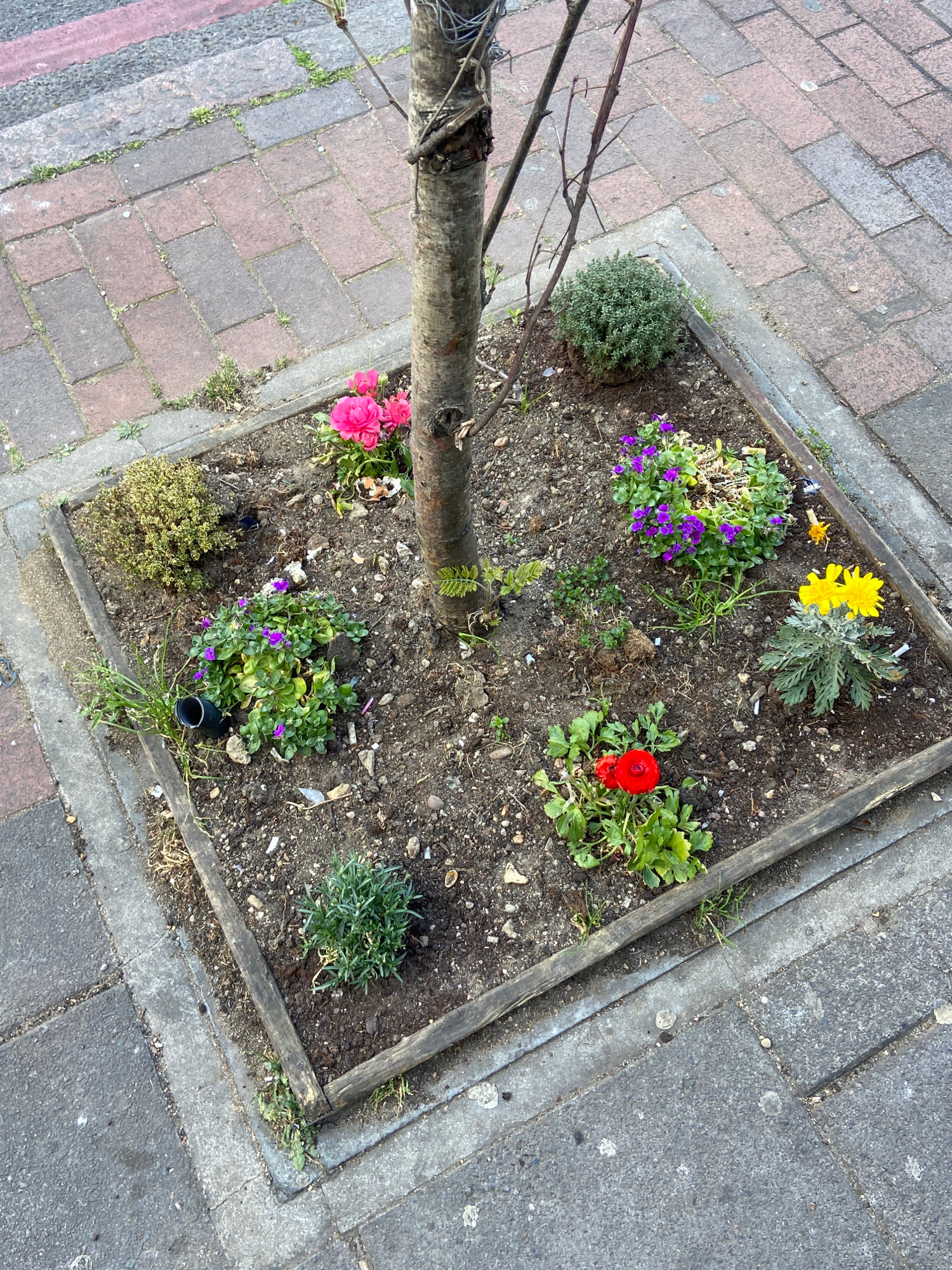 The image shows a square, wooden-framed flower bed built around the base of a tree on a street in London, United Kingdom. The flower bed contains a variety of flowers including yellow, purple, pink, a…read more