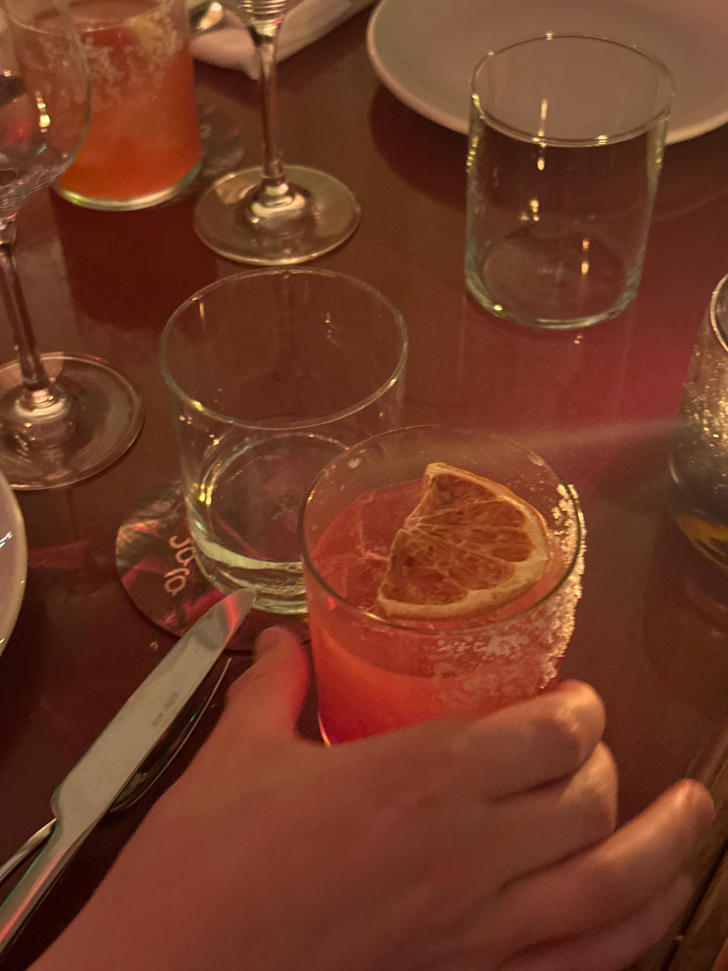 The image shows a table setting, likely in a restaurant. There are several glasses, some empty and some containing what appears to be a pink cocktail with a dried orange slice. One glass has a saltedβ¦read more