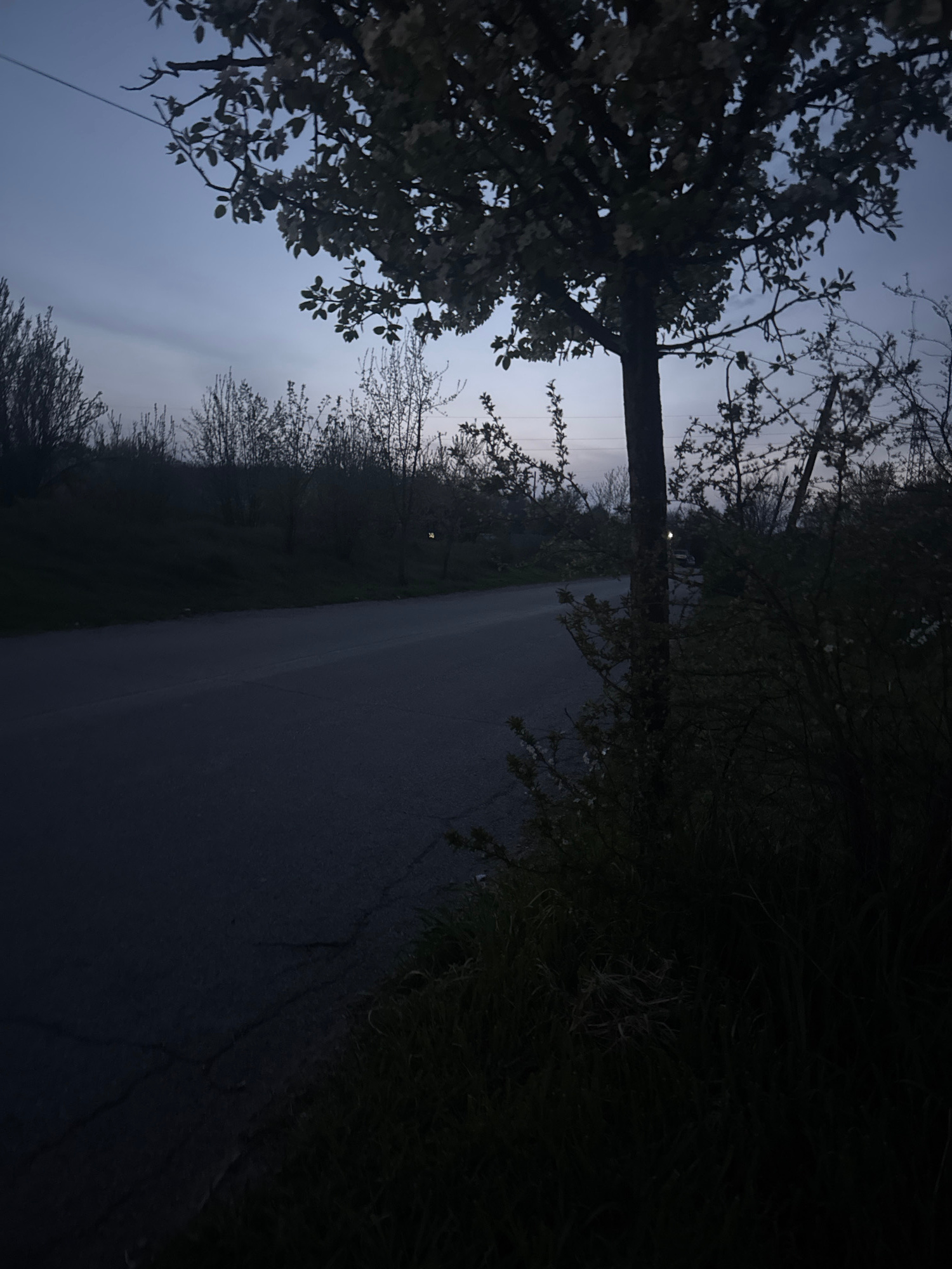 The image depicts a rural road in Montana, Bulgaria, at dusk or night. A tree with white blossoms stands to the left of the road. The road surface appears dark and smooth. Dense vegetation borders the…read more