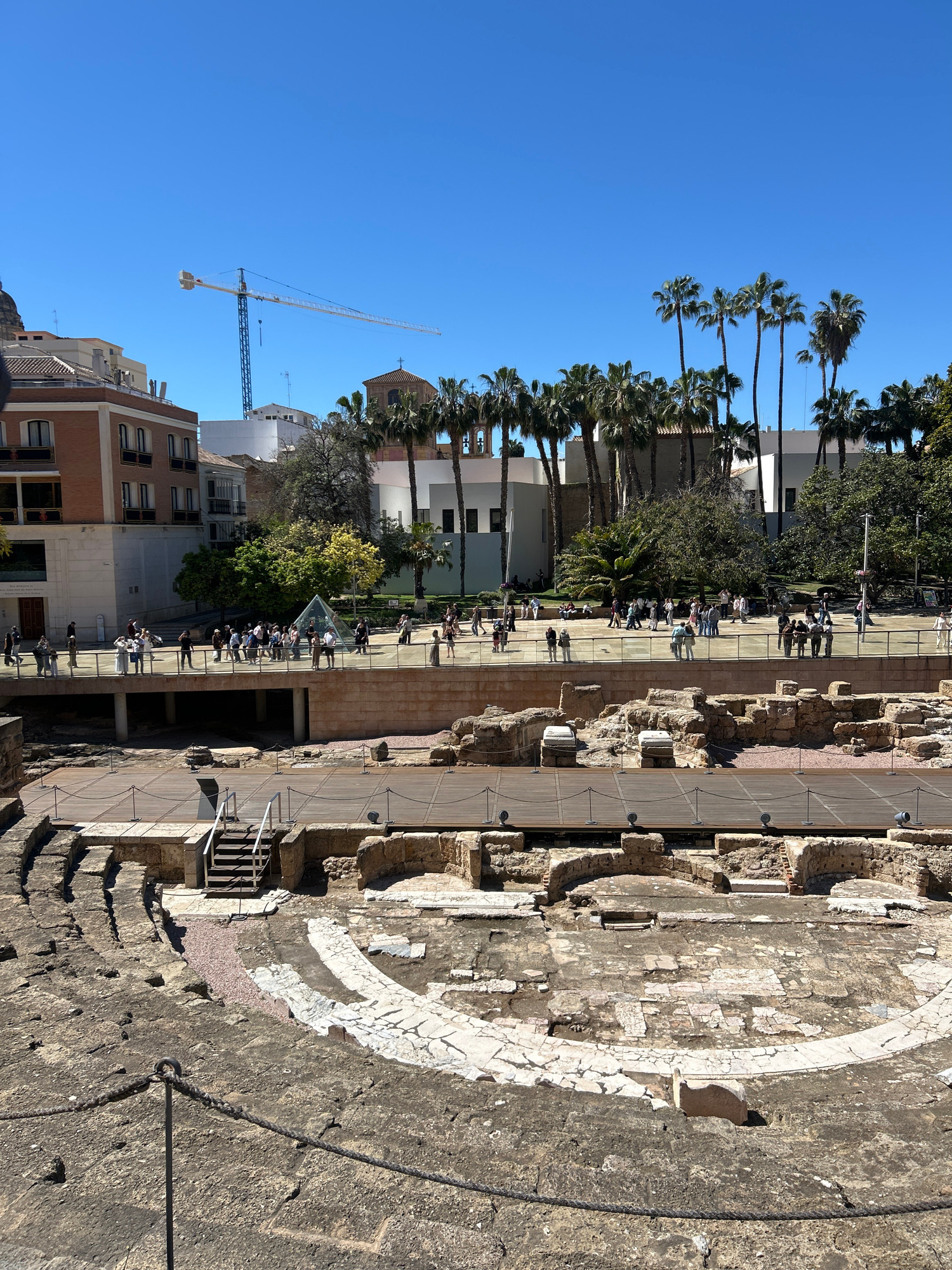 The image shows the Roman Theatre of Málaga, Spain, with ruins and stone structures in the foreground. A wooden boardwalk has been constructed for visitors to access the site. People are seen walking…read more