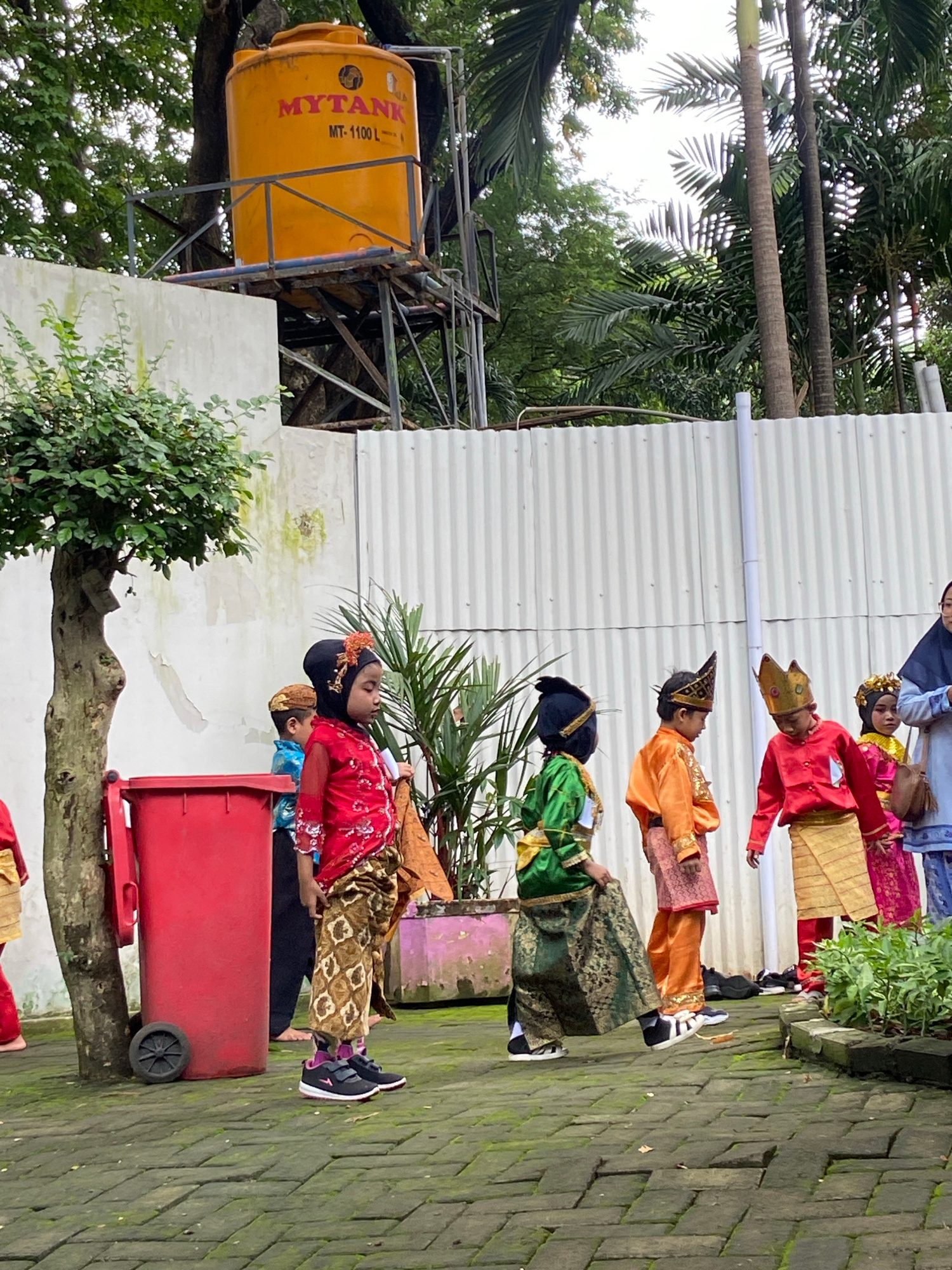 This outdoor image, taken in Surabaya, Indonesia, features a group of children and at least one adult adorned in vibrant traditional Indonesian costumes. The scene unfolds in what appears to be a pave…read more