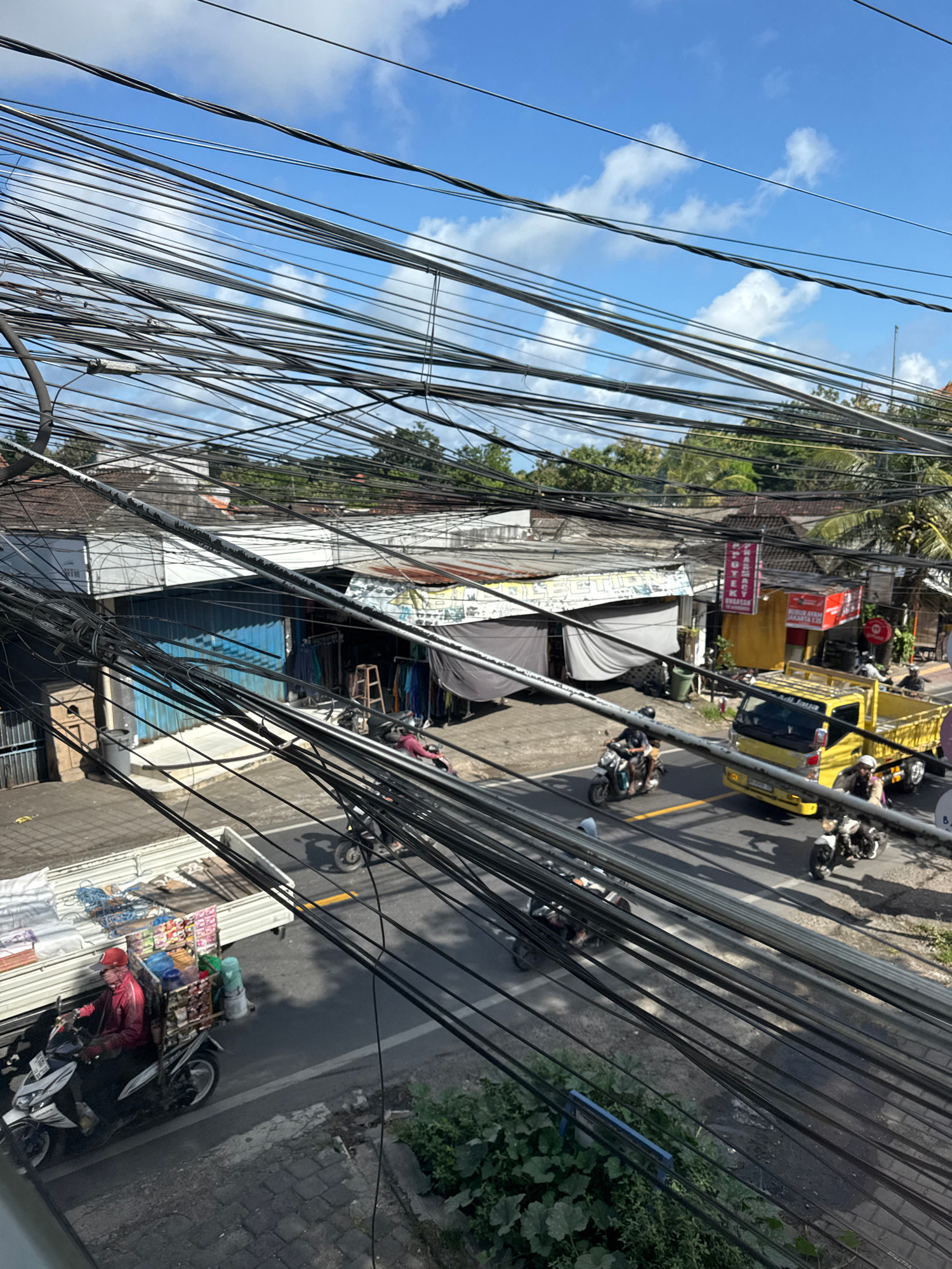 View from above overlooking a street scene in Ungasan, Indonesia. Dense network of tangled black electrical wires in the foreground obscures parts of the view. Buildings of varying sizes and condition…read more