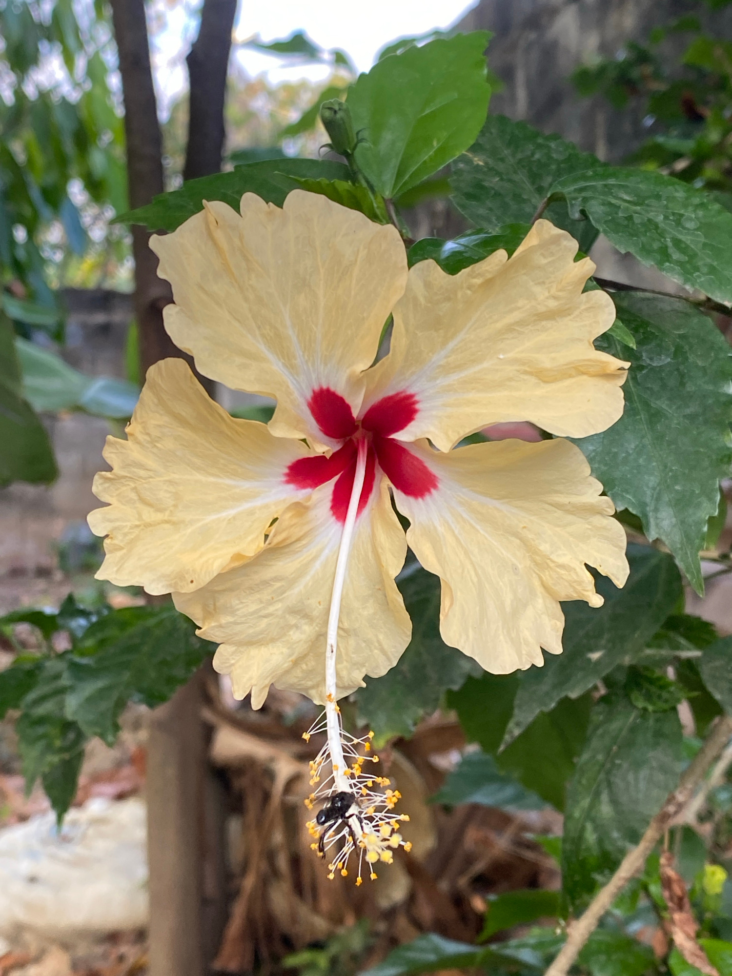 A high-angle, close-up shot depicts a light yellow hibiscus flower with a red center, amidst green leaves, likely in an outdoor setting. The location is Tinaquillo, Venezuela. An insect is visible on…read more
